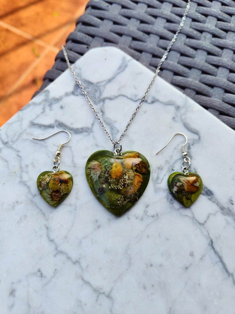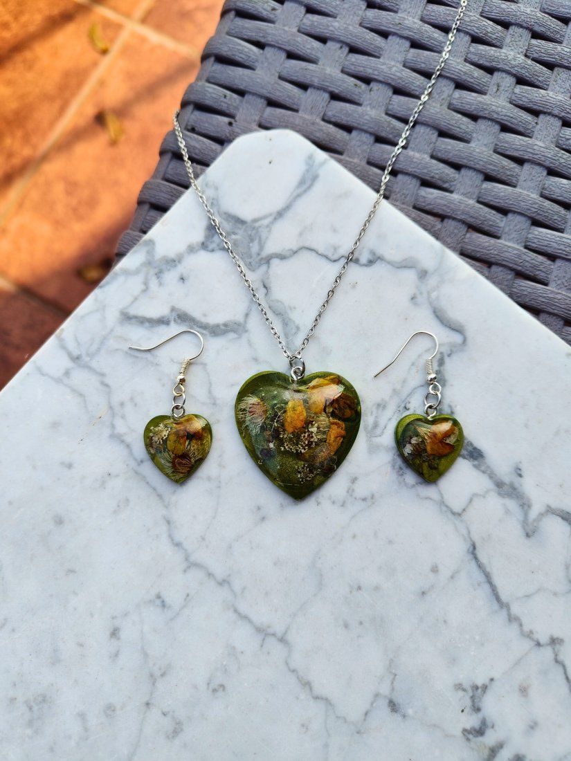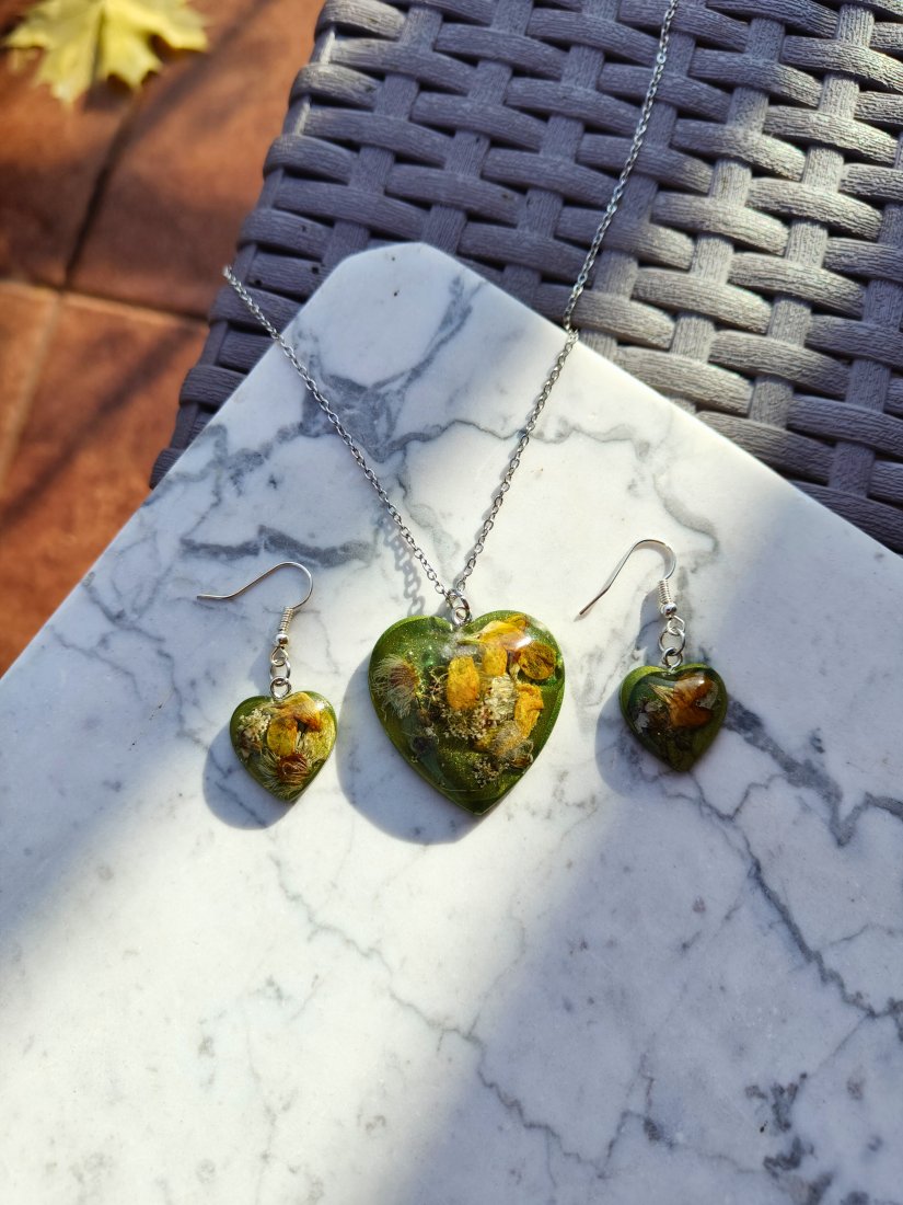 Zachwyć się naturalnym pięknem zamkniętym w sercu! Ten wyjątkowy komplet biżuterii składa się z delikatnych kolczyków oraz dopasowanego wisiorka, wykonanych z wysokiej jakości żywicy epoksydowej z zatopionymi suszonymi kwiatami. Każdy element tego kompletu to unikatowa biżuteria – niepowtarzalny, ręcznie wykonany dodatek, który podkreśli Twój styl i osobowość.