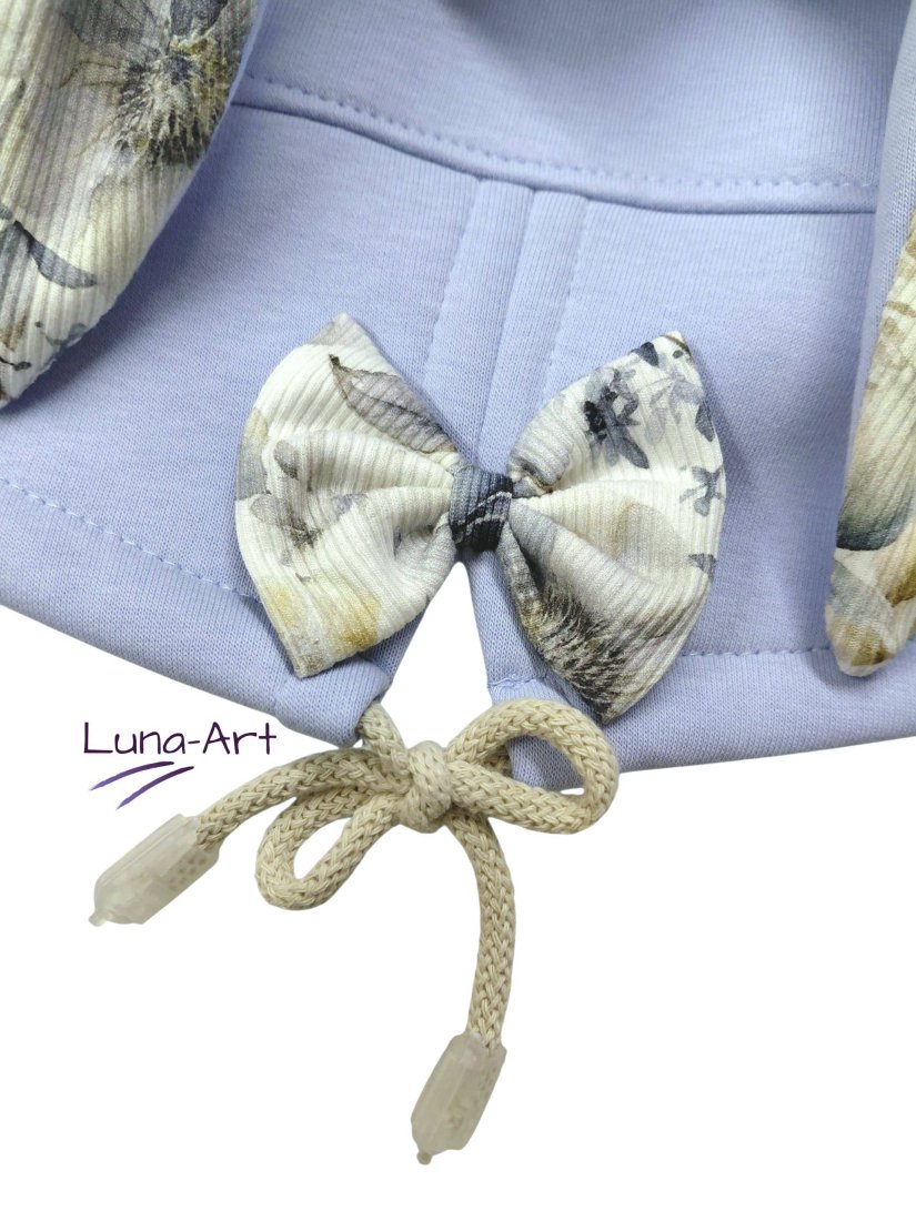 W kapturze, uszach, na końcówkach rękawów oraz ozdobne kokardki to dzianina prążkowana w kwiatki wzór cyfrowy.