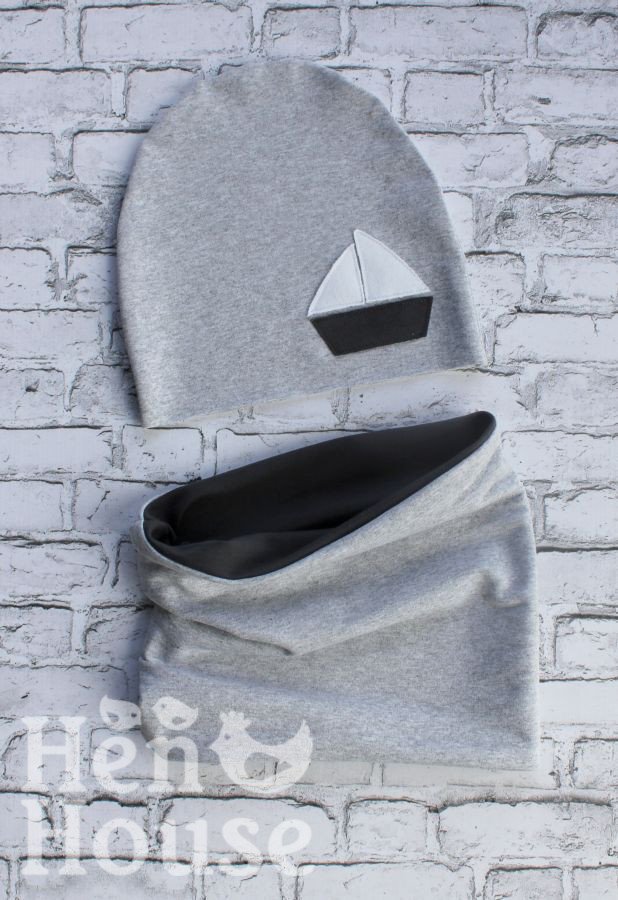 Komplet Boat czapka + komin. Lekki dzianinowy komplet z morską apilacją. Wykonany w 100% ręcznie. Jest wygodny i bardzo modny. Komplet wykonany jest z dzianiny dresowej z dodatkim elastanu, dlatego też czapka przylega do główki dziecka chroniąc uszka, a komin szyję i NIE stanowi jedynie elementu dekoracyjnego :) Tworzymy go we wszystkich rozmiarach, na osoby dorosłe również :) Czapka jest pojedyńcza. Kominy można nosić naprzemiennie - na szarej bądź kolorowej stronie. Kolor aplikacji (łódka i żagle) jak i materiału dobieramy indywidualnie, bo zadania specjalne to nasza specjalność :)