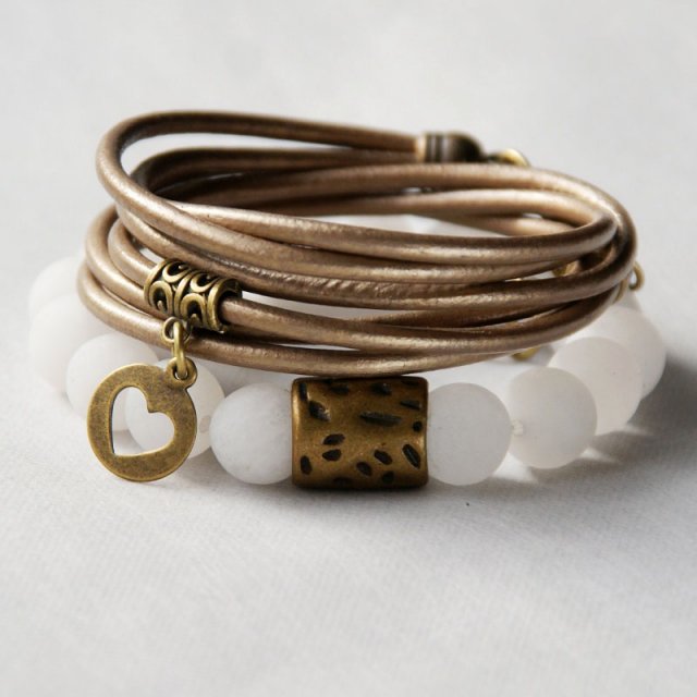 KOMPLET 2 BRANSOLETEK - razem taniej! niezwykle efektowne bransoletki - jedna na solidnej lince elastycznej, wykonana ze sporych kul MATOWEGO białego jadeitu (12mm) oraz masywnej metalowej przekładki - pasuje na nadgarstek 15,5-16,5cm ; druga z 3 rzemieni (3mm) ze 100% skórki naturalnej w metalicznym odcieniu - zapinana na karabińczyk - dł. regulowana za pomocą solidnego, ozdobnego łańcuszka... wykończenie obu bransoletek w kolorze antycznego złota... BRANSOLETKI PASUJĄ NA NADGARSTEK 15,5-16,5cm.... BIŻUTERIA ZAWSZE PODRÓŻUJE W OZDOBNYM OPAKOWANIU :-) ... zobacz całą kolekcję!