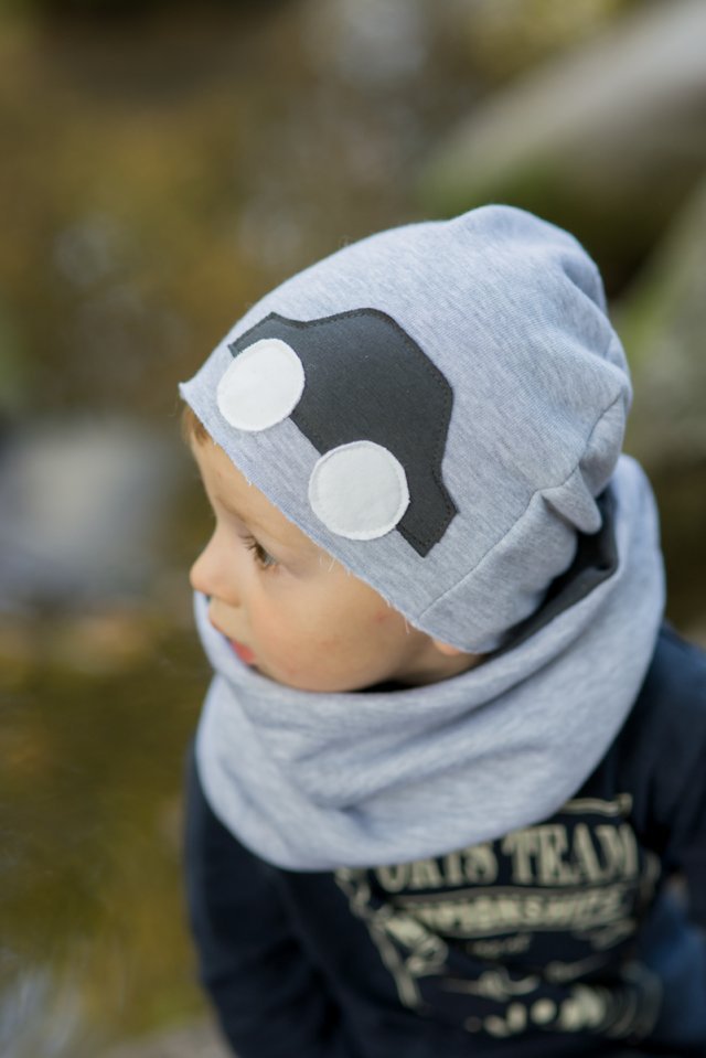Komplet Car czapka + komin. Lekki dzianinowy komplet z samochodową aplikacją. Wykonany w 100% ręcznie. Jest wygodny i bardzo modny. Komplet wykonany jest z dzianiny dresowej z dodatkim elastanu, dlatego też czapka przylega do główki dziecka chroniąc uszka, a komin szyję i NIE stanowi jedynie elementu dekoracyjnego :) Tworzymy go we wszystkich rozmiarach, na osoby dorosłe również :) Czapka jest pojedyńcza. Kominy można nosić naprzemiennie - na szarej bądź kolorowej stronie. Kolor aplikacji (auto+koła) jak i materiału dobieramy indywidualnie, bo zadania specjalne to nasza specjalność :)