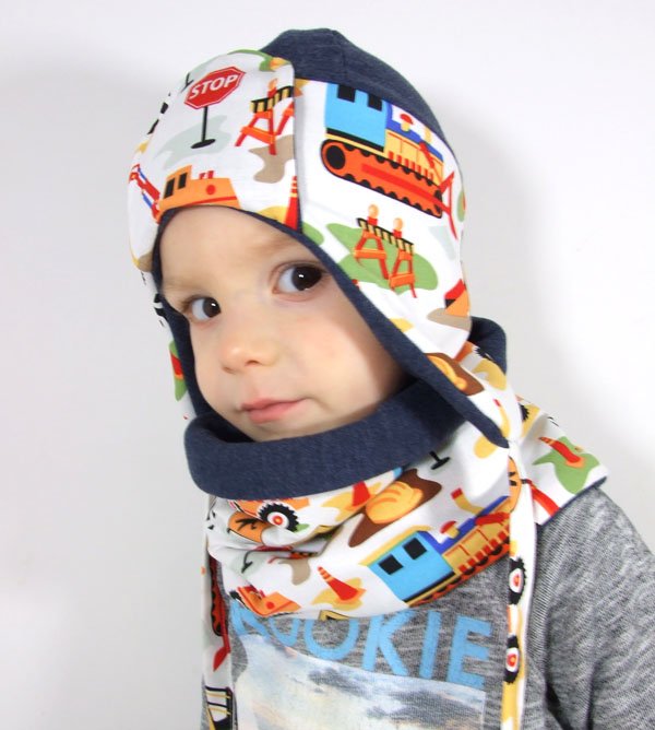 Komplet czapka i komin wykonane w dzianiny dresowej, wykończone bawełną w koparki, uszyte z dbałością o szczegóły i komfort dziecka, komin o wymiarach 30 cm x 60 cm. Czapka jest uszyta z dwóch warstw dzianiny i jednej warstwy bawełny, jest ciepła i wygodna. Po zakupie należy podać rozmiar w cm (obwód głowy).