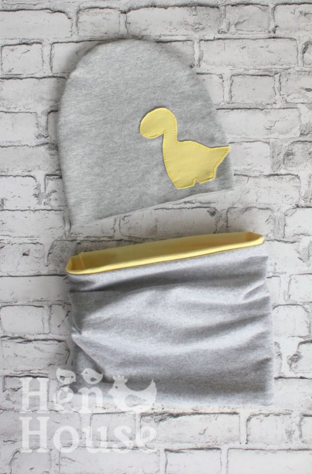Komplet Dino czapka + komin. Lekki dzianinowy komplet z alikacją. Wykonany w 100% ręcznie. Jest wygodny i bardzo modny. Tworzymy go we wszystkich rozmiarach, na osoby dorosłe również :) Czapka jest pojedyncza. Kominy można nosić naprzemiennie - na szarej bądź kolorowej stronie. Kolor gwiazd jak i materiału dobieramy indywidualnie, bo zadania specjalne to nasza specjalność :)