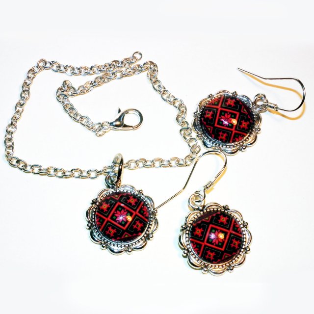 Tagi: #czerwone kolczyki, #folkowy, #komplet biżuterii, #z grafiką