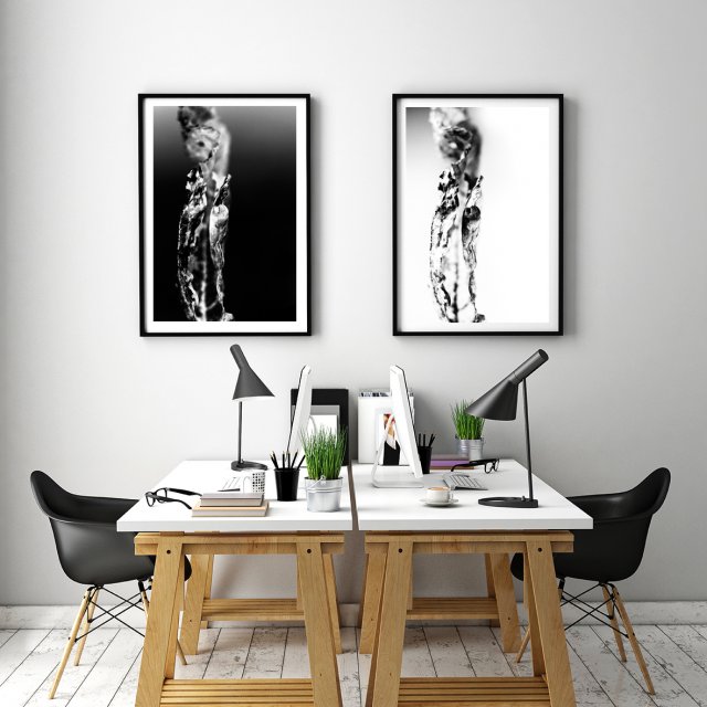 Komplet dwóch fotografii z serii "LEAF". Każda fotografia o wymiarach 30 x 40 cm. Wydruk na profesjonalnym papierze o wytrzymałości 70 lat. Fotografie oprawione - czarna, aluminiowa, satynowa rama. Termin realizacji zamówienia to 7 dni.