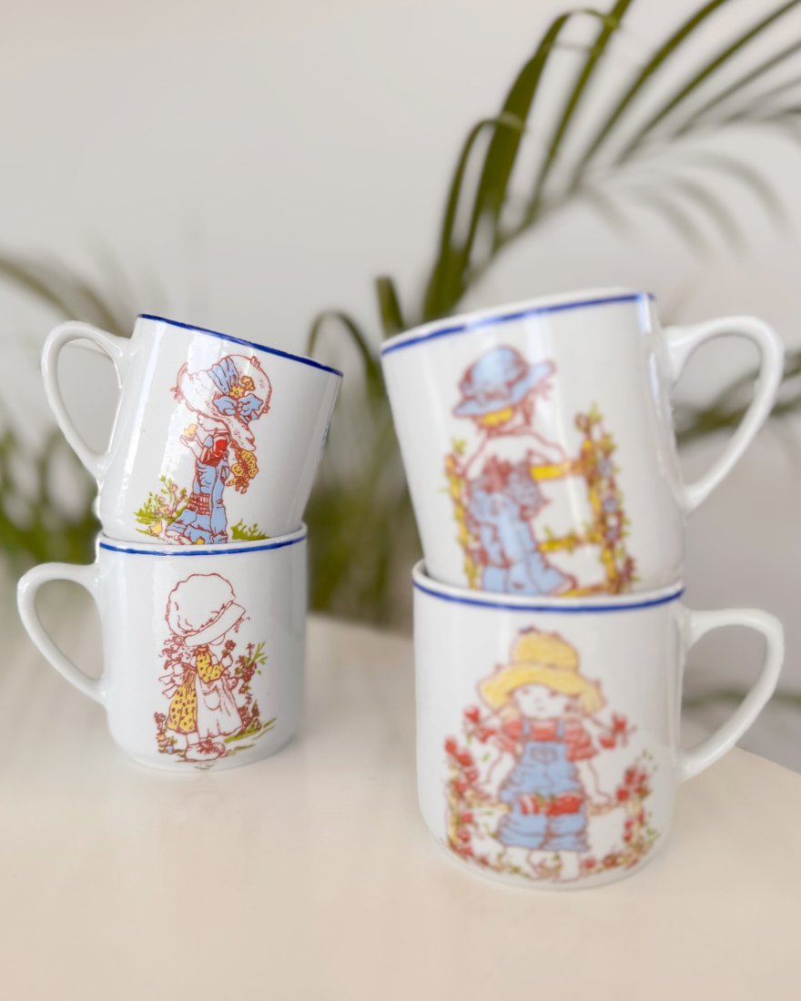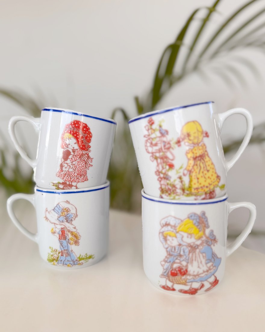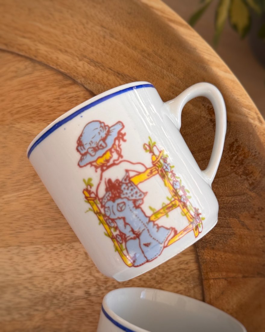 Komplet 4 kubków dziecięcych wykonany z porcelany, zdobiony trwałymi kalkomaniami z obrazkami i logo CZMP Centrum Zdrowia Matki Polki.