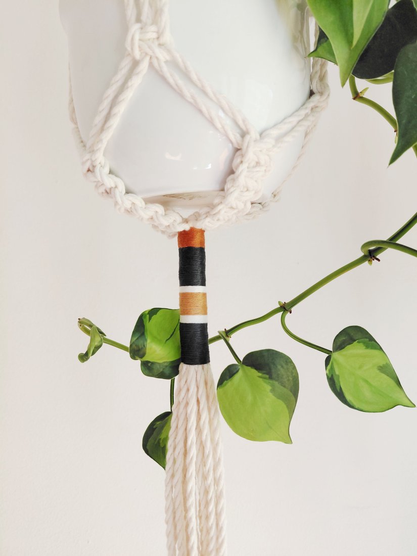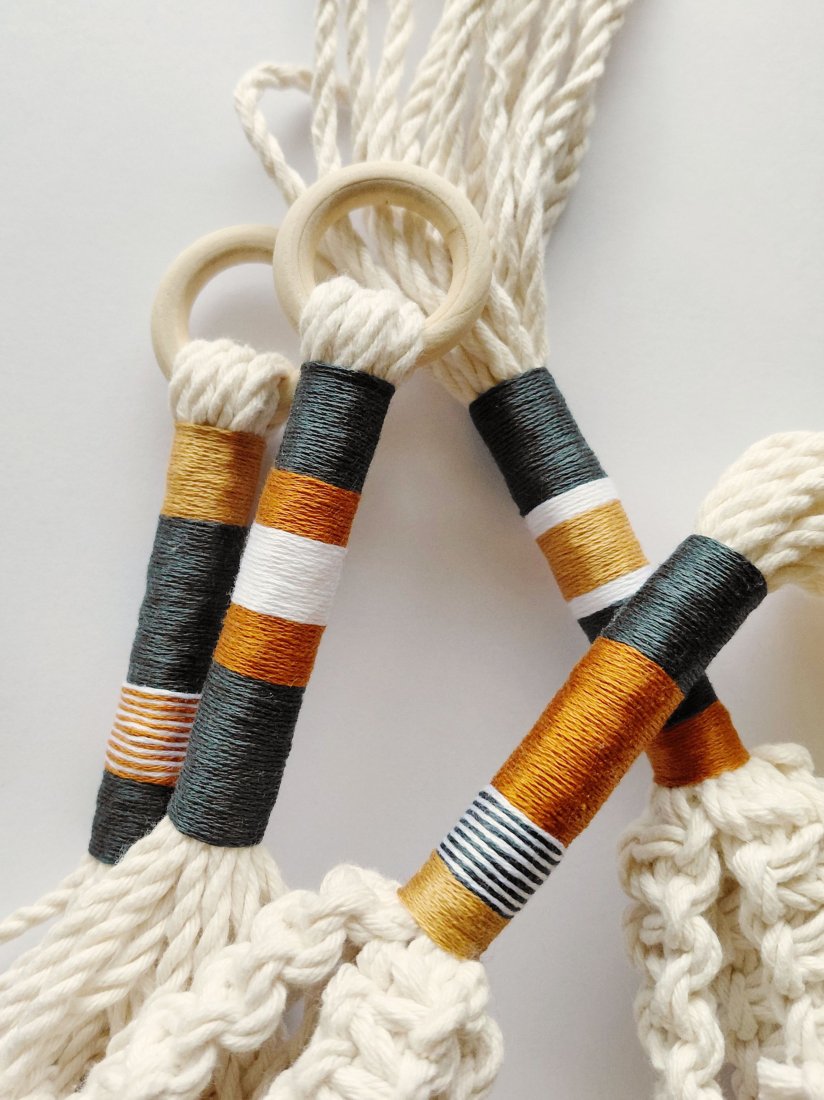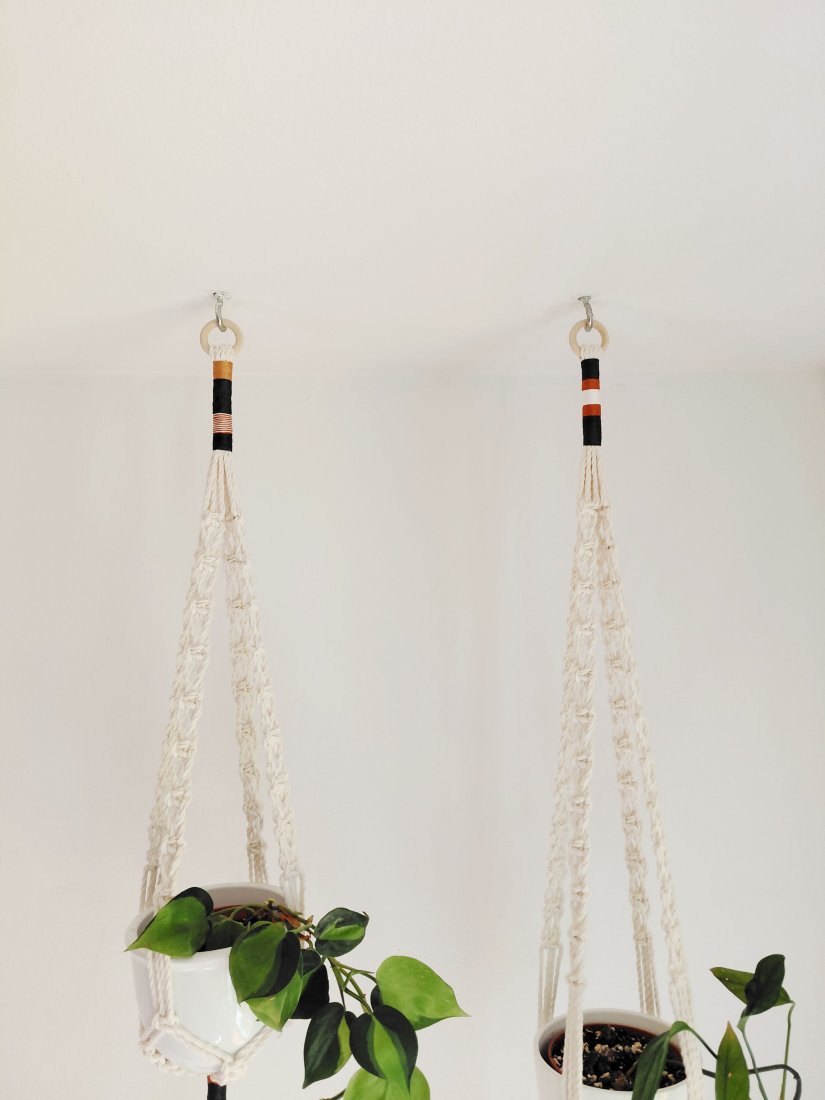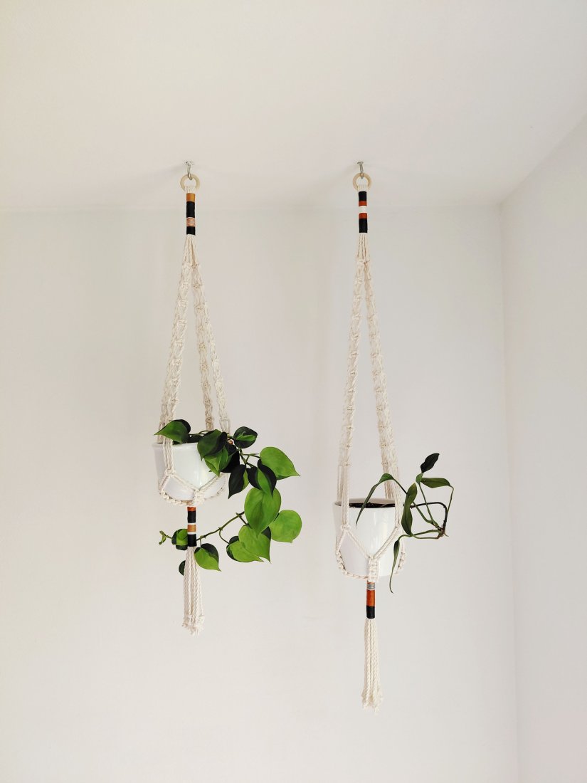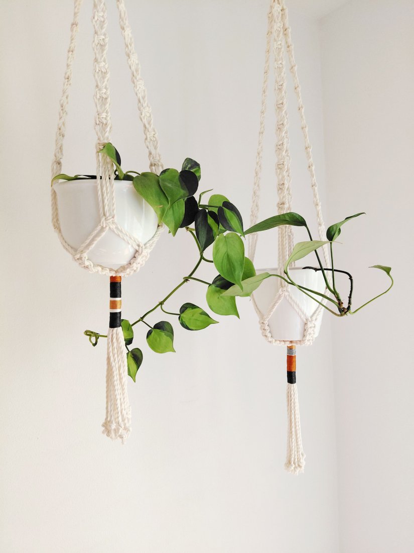 Komplet kwietników z makramy z kolorowymi akcentami.