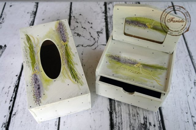 Komplet składa się z ręcznie malowanego farbami akrylowymi (ekologicznymi) drewnianego chustecznika oraz toaletki z lusterkiem i szufladką na biżuterię lub inne skarby. Pudełka można przecierać mokrą ściereczką.