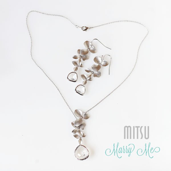 Ślubny komplet złożony z długich kolczyków oraz asymetrycznego naszyjnika. Wykonany z brązu platerowanego srebrem rodowanym i kryształów. Bardzo oryginalny leciutki. Długość całkowita kolczyków : 5,6 cm. Naszyjnik: 42,5 cm plus 3 cm wisiorek - jeden listek i kryształ. Kryształ w naszyjniku mierzy 15 x 18 mm . Jeżeli potrzebna jest inna długość naszyjnika - proszę o info w formularzu zamówienia.