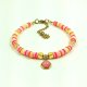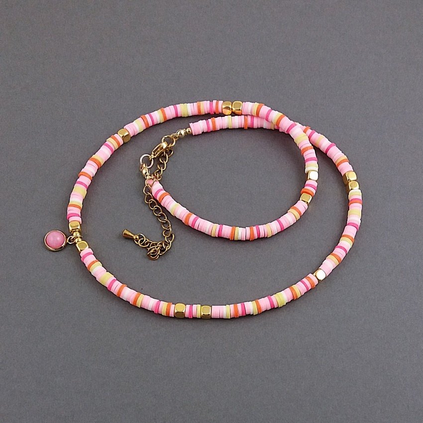 Uroczy, kolorowy, letni komplet biżuterii-krótki naszyjnik i bransoletka, wykonane z krążków katsuki (koraliki polimerowe) i kostek złotego, błyszczącego hematytu. Koraliki mają średnicę 4mm. Zawieszki to malutkie (6mm) kaboszony z różowego jadeitu, oprawione w pozłacaną stal szlachetną.
