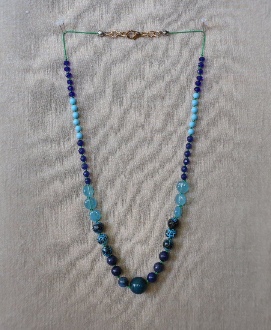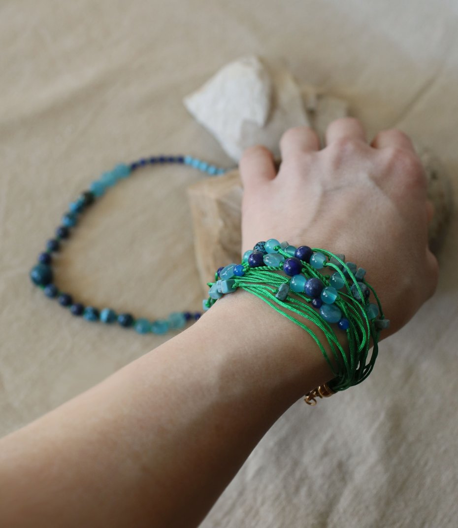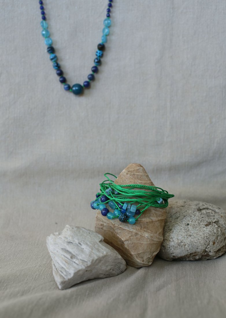 Naszyjnik i bransoletka w duchu boho, w tonacji zielono-niebieskiej, wykonane ze sznurków i różnorodnych koralików. Bransoletka zwijana na dwa razy. Bigle i łączniki ze stali w kolorze złota. Bransoletka pasuje na nadgarstek o obwodzie 17-18 cm. Długość naszyjnika: 46 cm.
