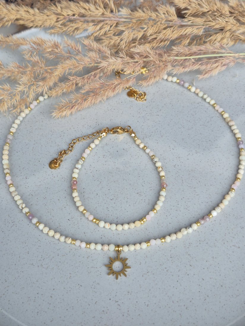 Wprowadź do swojej garderoby odrobinę słońca i radości dzięki temu wyjątkowemu zestawowi z kamieni naturalnych. Połączenie ciepłych barw opali i delikatnego różu turmalinu tworzy kompozycję pełną blasku, optymizmu i kobiecej energii.
