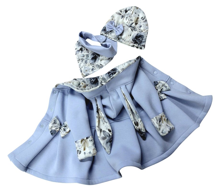 W kapturze, uszach, na końcówkach rękawów oraz ozdobne kokardki to dzianina prążkowana w kwiatki wzór cyfrowy.