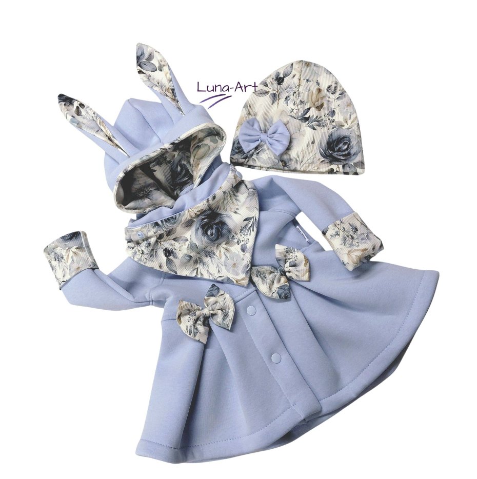 4.  > Komplet płaszczyk z uszami oraz czapka i chustka r.128/134 (nr 7114427)