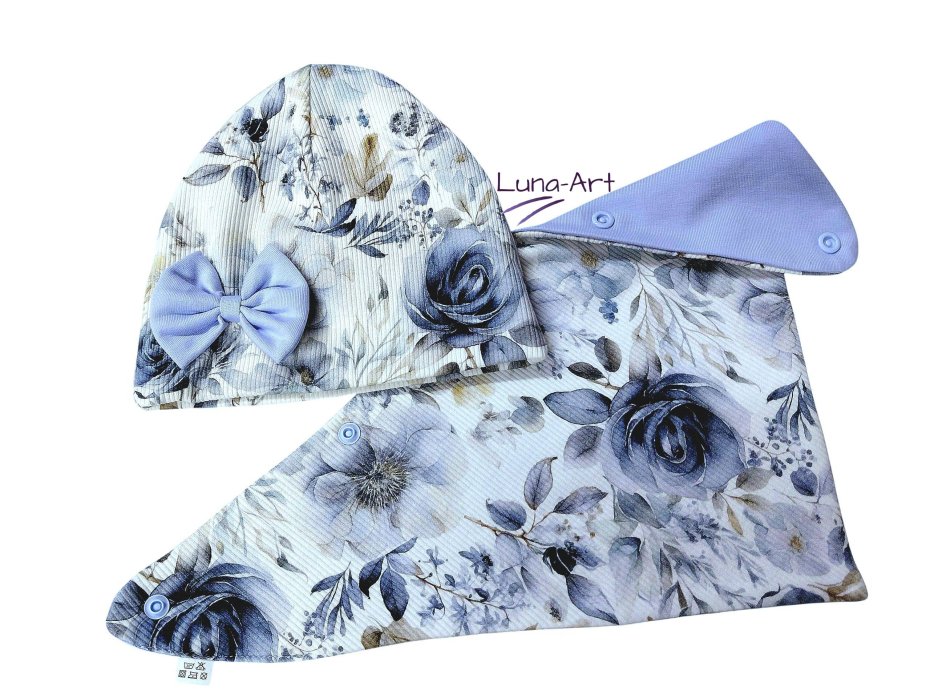 Czapka z podwójnej warstwy prążka z kokardką obwód głowy dopasowany do rozmiaru oraz chustka dwustronna mała zapinana na napy, wymiary 42cm/32cm/32cm.