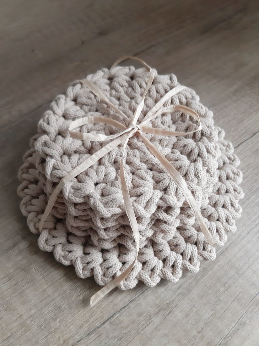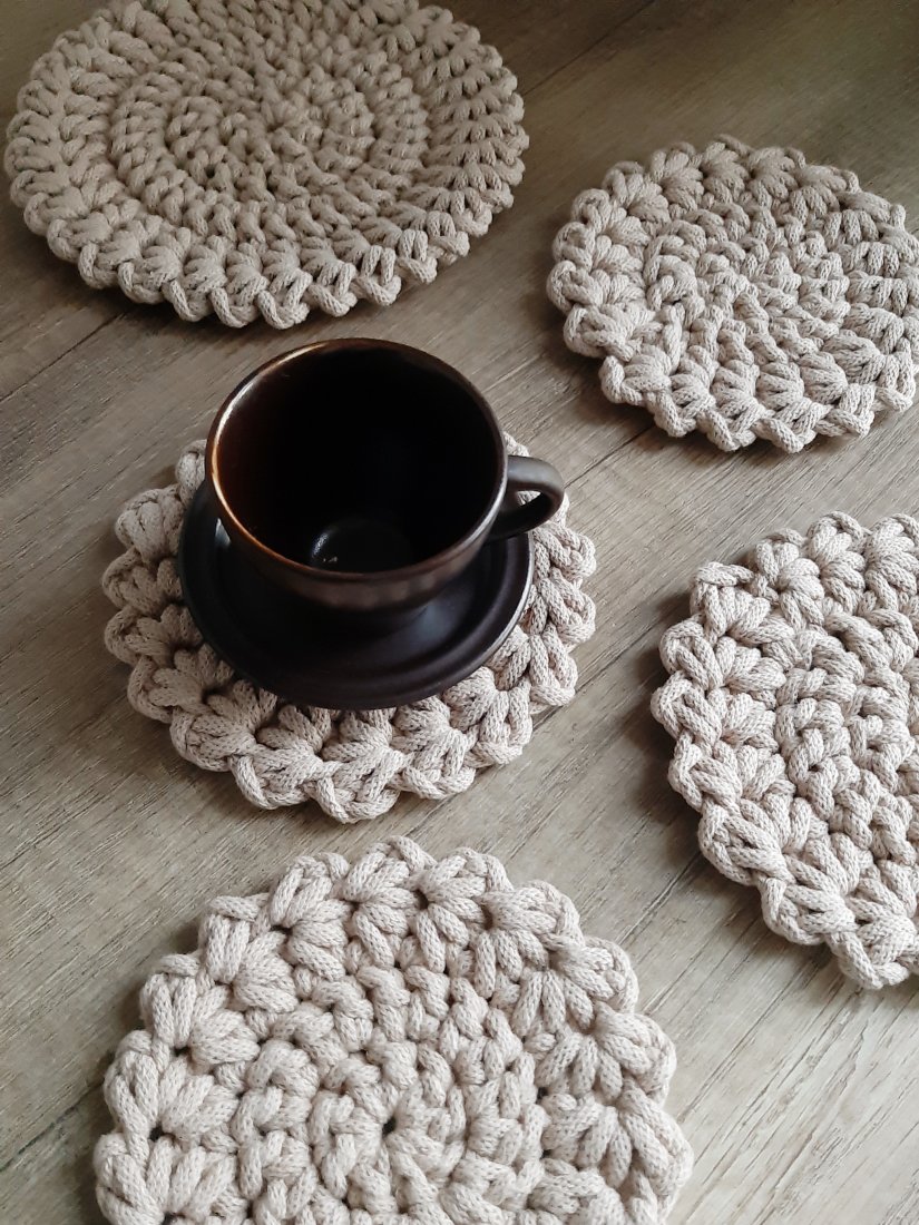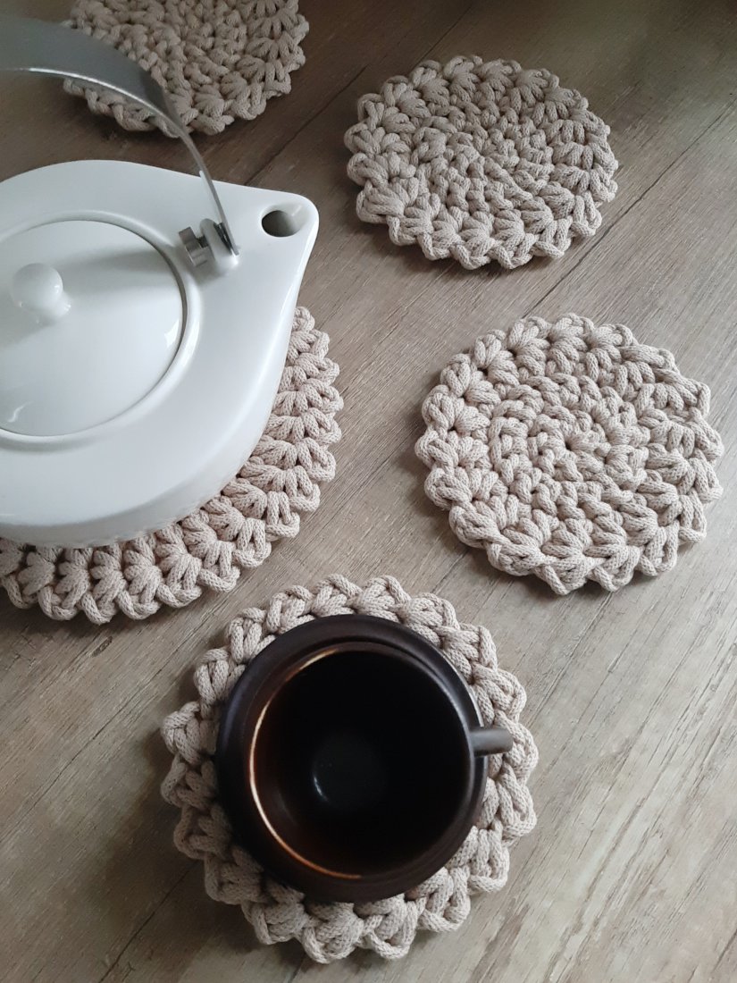 Komplet podkładek wykonanych ręcznie z bawełnianego sznurka grubości 0,3cm w ciepłym odcieniu beżu.