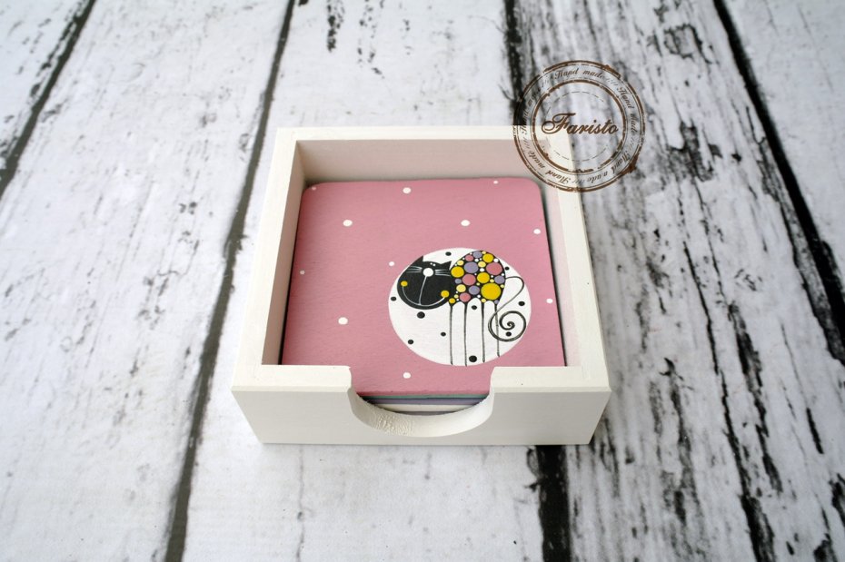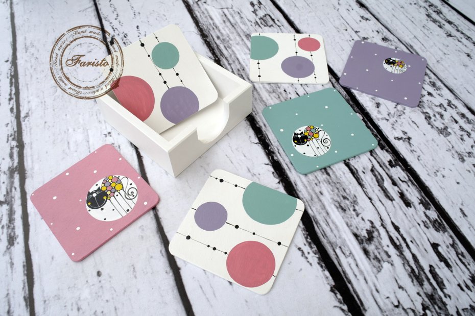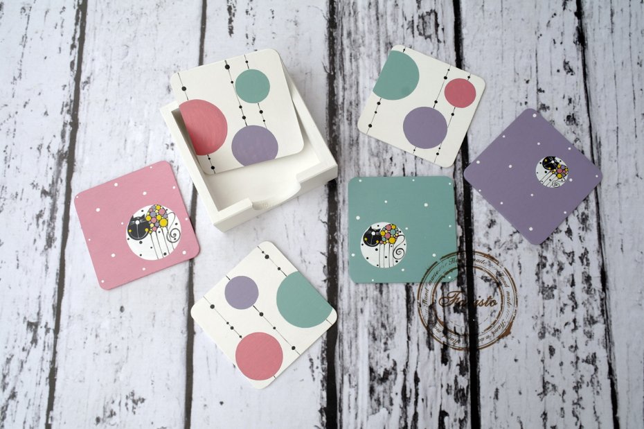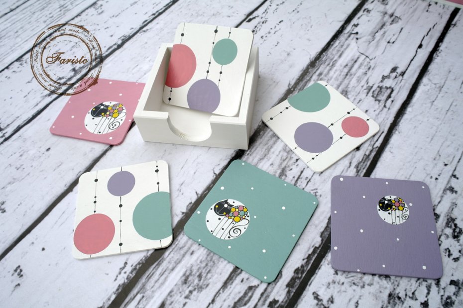 Zestaw składa się z sześciu podkładek oraz pojemniczka, w którym mogą być przechowywane. Komplet został ręcznie pomalowany farbami akrylowymi (ekologicznymi). Dodatkowo wzór na podkładach został zabezpieczony lakierem bezbarwnym, co pozwala na ich mycie wilgotną ściereczką i zapobiega uszkodzeniu przez ewentualne rozlanie napoju.