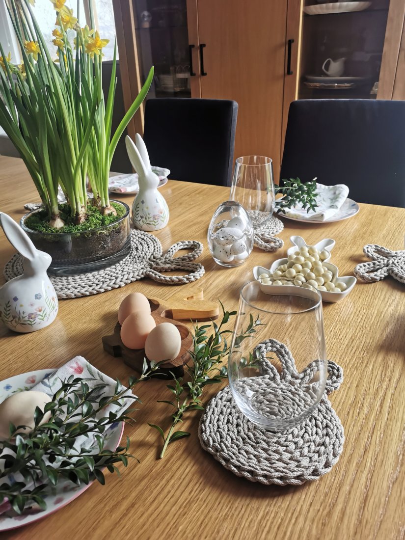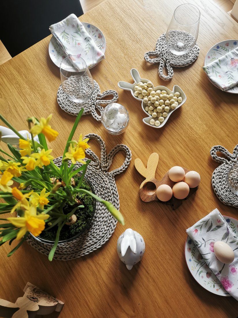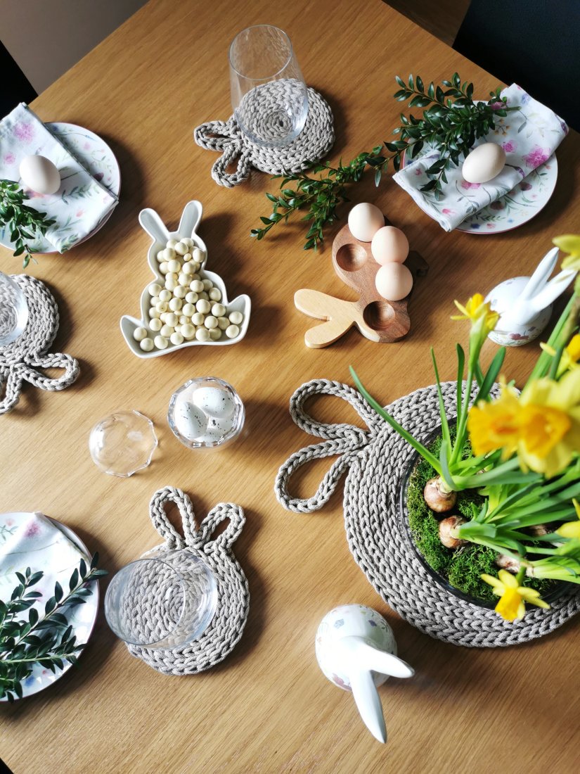 Komplet podkładek na stół z uszami królika (jedna duża podkładka + 4 szt. małych podkładek pod kubek) wykonany ze sznurka bawełnianego.