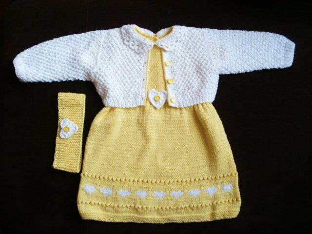 3-częściowy komplet dla małej elegantki wykonany w całości ręcznie,na drutach i na szydełku z mięciutkiej włóczki bawełnianej w kolorze słonecznej żółci i bieli.