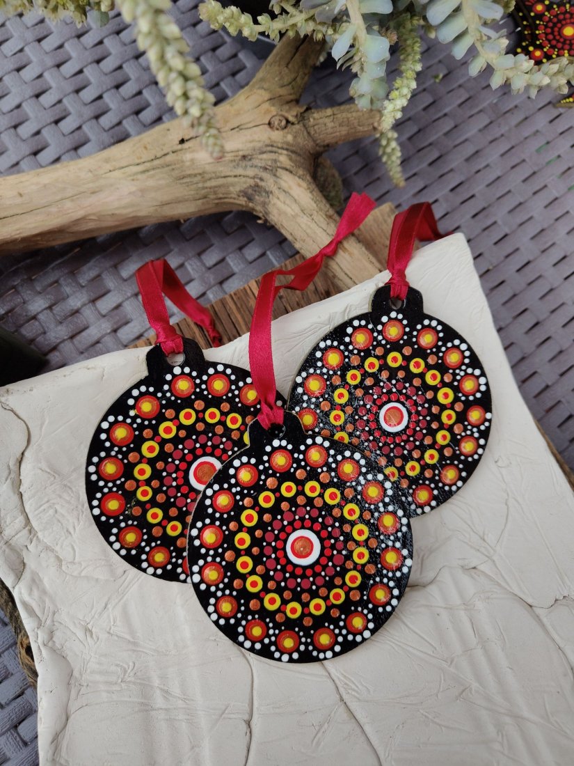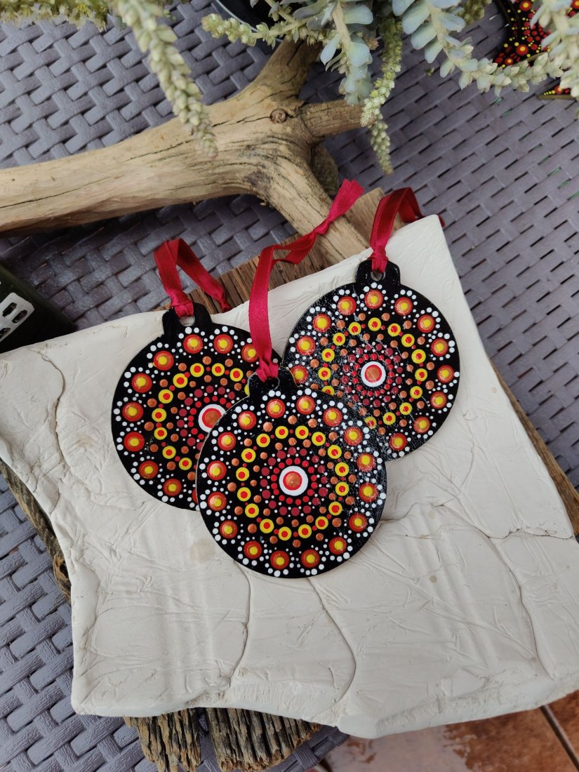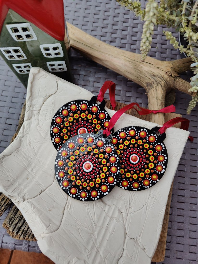 Ręcznie malowane bombki w stylu mandali to wyjątkowa ozdoba świąteczna, która doda blasku i artystycznego charakteru każdej choince. Każda bombka wykonana jest na czarnym tle, na którym precyzyjnie naniesiono misterny wzór z kropek w odcieniach czerwieni, złota, bieli oraz żółtego. Tworzą one hipnotyzujący, symetryczny motyw mandali, który pięknie odbija światło i przyciąga wzrok.