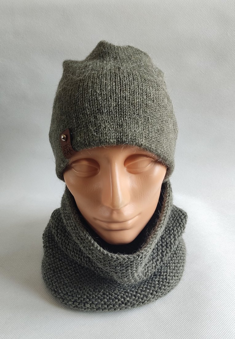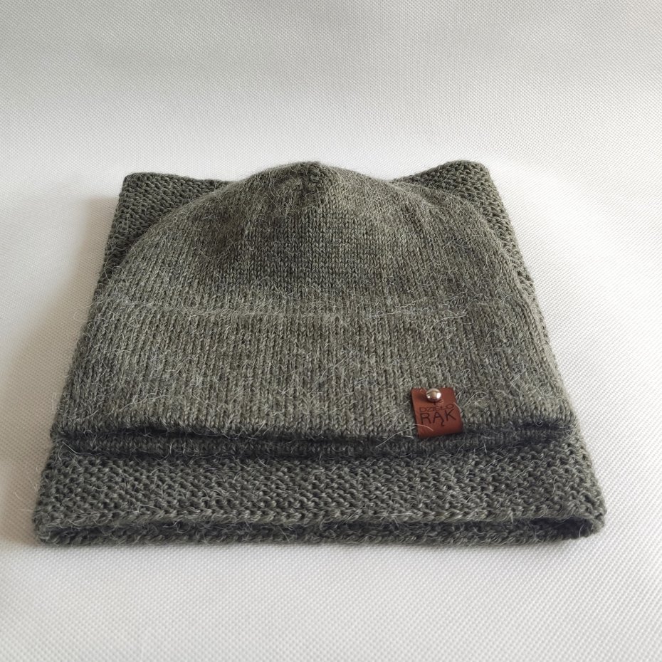 W skład zestawu wchodzi komin tuba i czapka o klasycznym fasonie, na szerokim podwójnym podwinięciu, dopasowującym się do kształtu głowy.