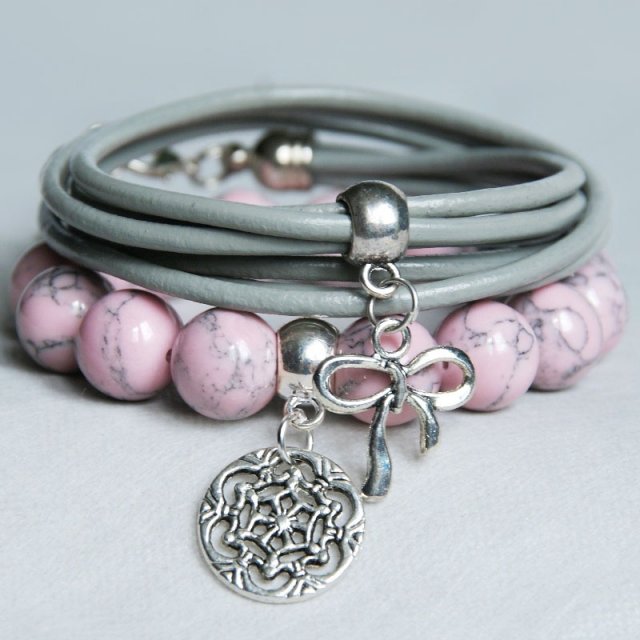 KOMPLET 2 BRANSOLETEK - razem taniej! WARTOŚĆ ZESTAWU: 111zł.. TUTAJ: 99zł !!! niezwykle efektowne bransoletki - jedna na solidnej, podwójnej lince elastycznej, wykonana ze sporych kul jasno-różowego howlitu (12mm) oraz 1 kuli srebrnego hematytu (kule 8mm) - pasuje na nadgarstek 14,5-15,5cm ; druga z 3 rzemieni (3mm) ze 100% skórki naturalnej - zapinana na karabińczyk - dł. regulowana za pomocą solidnego, ozdobnego łańcuszka... BRANSOLETKI PASUJĄ NA NADGARSTEK 14,5-15,5cm.... BIŻUTERIA ZAWSZE PODRÓŻUJE W OZDOBNYM OPAKOWANIU :-) ... zobacz całą kolekcję!