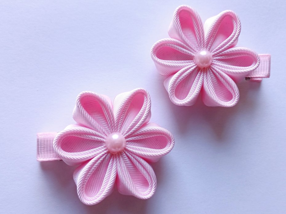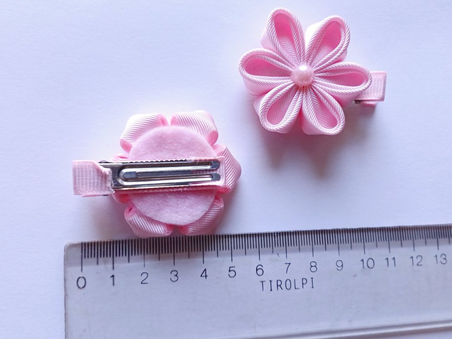 Spinki z kwiatami o średnicy ok 5cm, sama spinka również ma długość 5cm. Kwiaty wykonane ze wstążki rypsowej, w tym wariancie kolor różowy jasny. Środek to różowa półperełka. Komplet składa się z dwóch spinek.