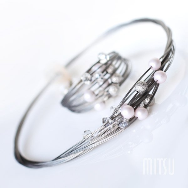 Komplet złożony z naszyjnika i bransolety. Wykonany na bazie stalowych linek, ozdobiony kryształami, matowymi perłami o leciutko różowej barwie i diamentowanymi kulami. Zakończenia w kolorze starego złota. Naszyjnik mierzy 45-50 cm, bransoleta 18-20 cm.
