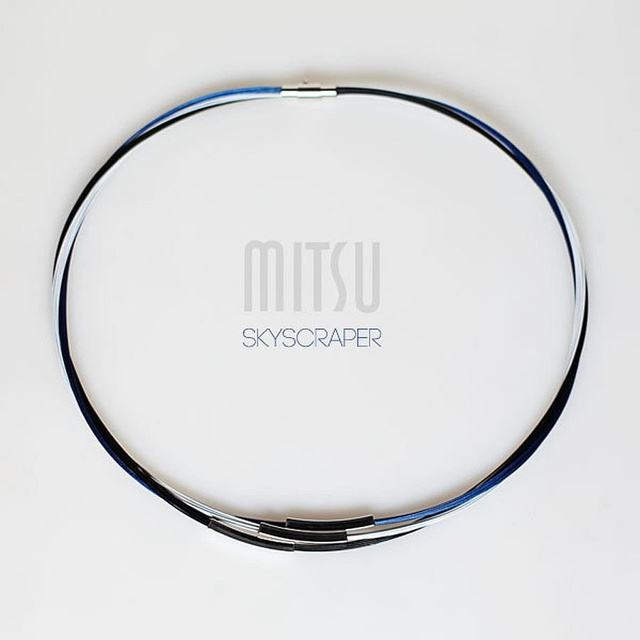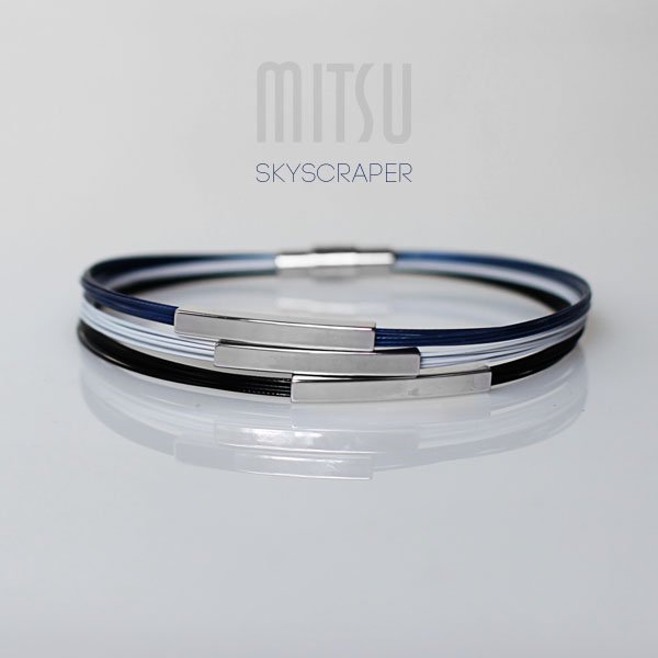 Zbudowany na bazie czarnej, białej i granatowej linki jubilerskiej.
