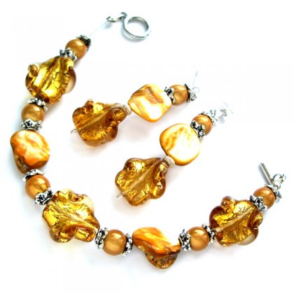Bransoletka: Korale lampwork, masa perłowa, koraliki, metalowe przekładki, linka jubilerska, srebrne zapięcie, obwód 19,5 cm