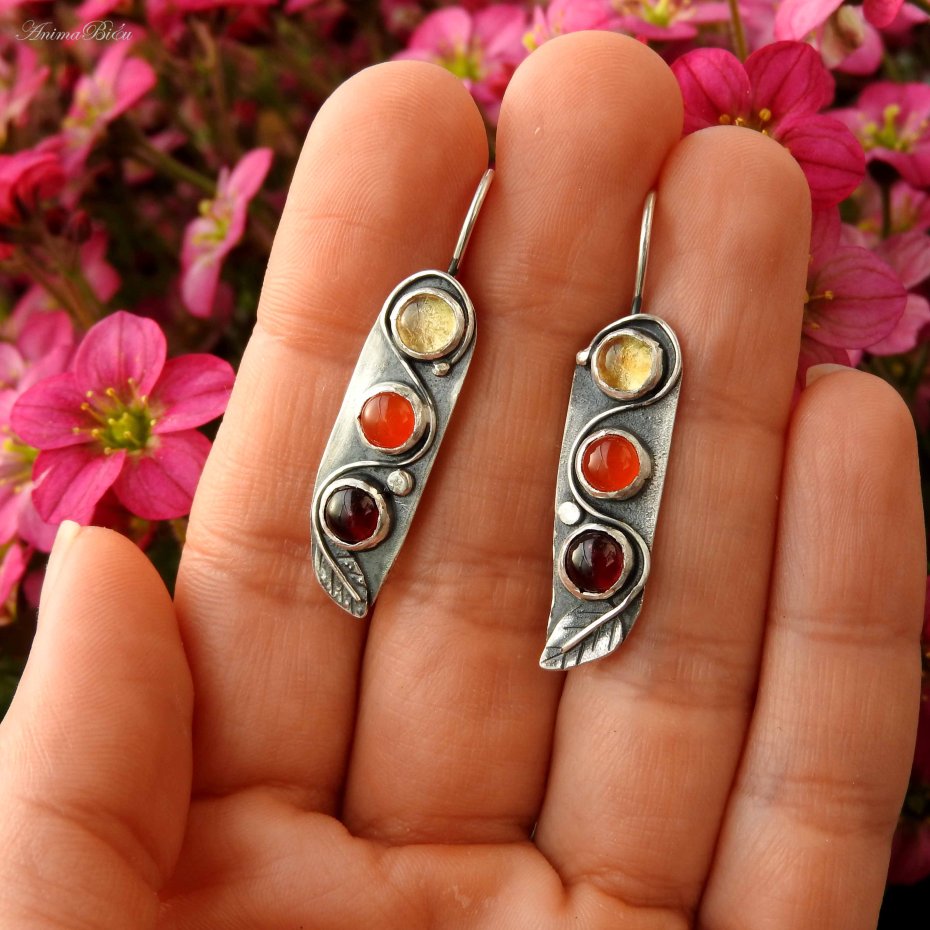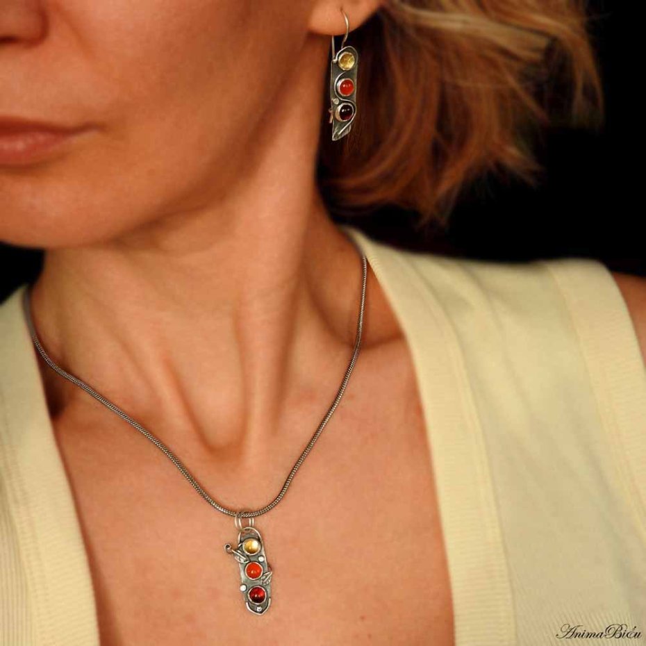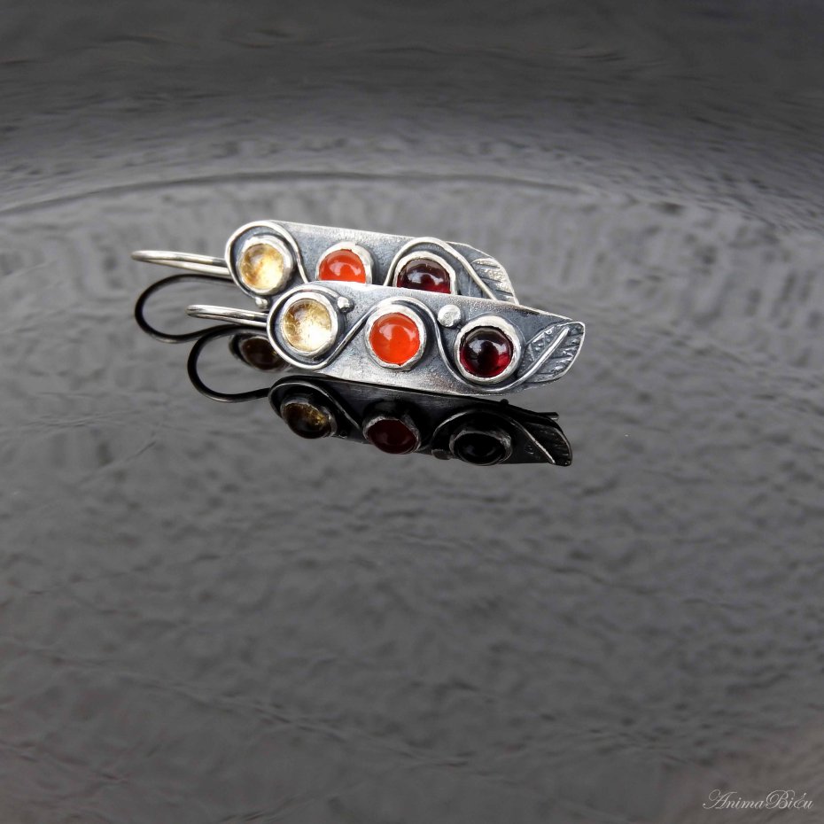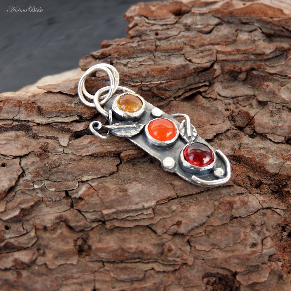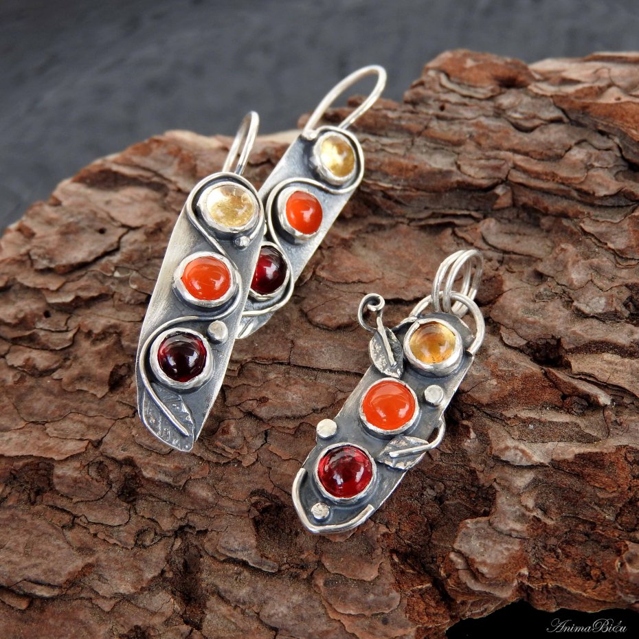 Komplet srebrny z minerałami. Ten komplet, na który składają się kolczyki i zawieszka powstał od podstaw ręcznie ze srebra próby 925 i 999. Umieściłam w nim minerały w ciepłej tonacji - cytryn, karneol i granat i dodałam roślinne zdobienia. Kolczyki zawiesiłam na ręcznie wykonanych, zamykanych biglach. Każdy z nich waży 2,7 gramy, długość kolczyka to 40 mm, szerokość 10 mm. Zawieszka ma długość 34 mm, szerokość 11 mm i waży 2,4 gramy. Dołączam do niej łańcuszek typu żmijka ze stali szlachetnej długości 50 cm (widoczny na zdjęciach). Technika wykonania: lutowanie, młotkowanie. Srebro przyciemniłam i wypolerowałam.