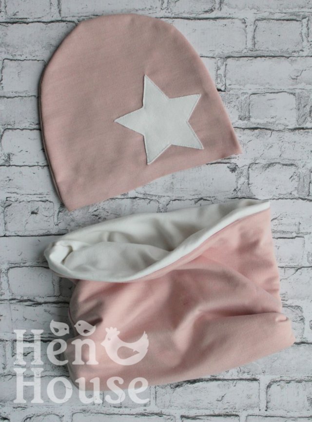 Komplet Star czapka + komin. Lekki dzianinowy komplet jest idealny na nadchodzący sezon. Wykonany w 100% ręcznie. Jest wygodny i bardzo modny. Tworzymy go we wszystkich rozmiarach, na osoby dorosłe również :) Kominy można nosić naprzemiennie - na różowej bądź białej stronie. Kolor gwiazd jak i materiału dobieramy indywidualnie, bo zadania specjalne to nasza specjalność