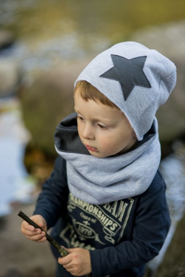 Komplet Satr czapka + komin. Lekki dzianinowy komplet z gwiezdną aplikacją. Wykonany w 100% ręcznie. Jest wygodny i bardzo modny. Komplet wykonany jest z dzianiny dresowej z dodatkim elastanu, dlatego też czapka przylega do główki dziecka chroniąc uszka, a komin szyję i NIE stanowi jedynie elementu dekoracyjnego :) Tworzymy go we wszystkich rozmiarach, na osoby dorosłe również :) Czapka jest pojedyńcza. Kominy można nosić naprzemiennie - na szarej bądź kolorowej stronie. Kolor aplikacji jak i materiału dobieramy indywidualnie, bo zadania specjalne to nasza specjalność :)