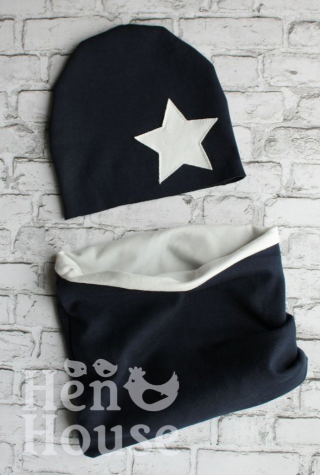 Komplet Star czapka + komin. Lekki dzianinowy komplet z gwiezdną aplikacją. Wykonany w 100% ręcznie. Jest wygodny i bardzo modny. Tworzymy go we wszystkich rozmiarach, na osoby dorosłe również :) Czapka jest pojedyńcza. Kominy można nosić naprzemiennie - na białej bądź granatowej stronie. Kolor gwiazd jak i materiału dobieramy indywidualnie, bo zadania specjalne to nasza specjalność