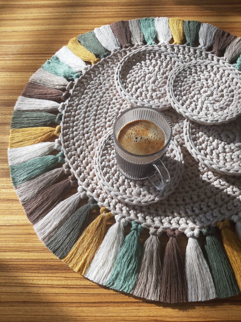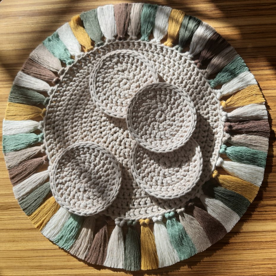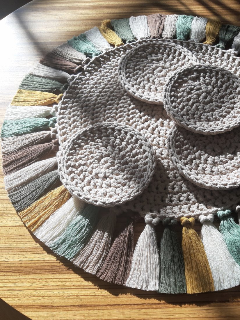 Komplet podkładek składający się z jednej dużej średnicy 60cm w kolorze ciepłego beżu i ozdobiona wielobarwnymi frędzlami /odcienie zieleni, beżu, musztardy/ plus cztery małe średnicy 15cm splecione ręcznie z certyfikowanego, 100% bawełnianego sznurka grubości 5mm.