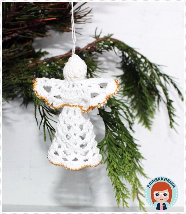Komplet trzech szydełkowych aniołków wykonanych z nici bawełnianych. Można je powiesić na choince lub postawić na stoliku jako samodzielną ozdobę.