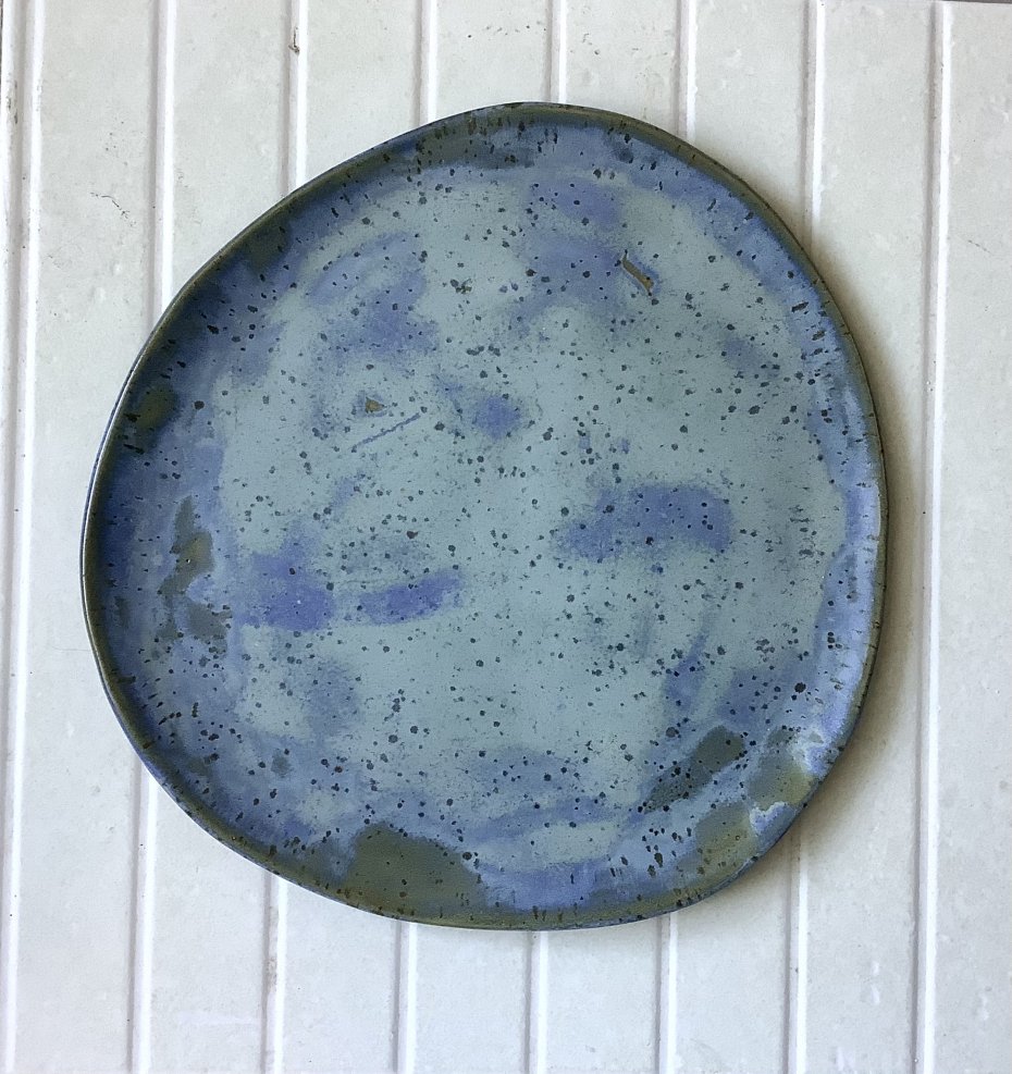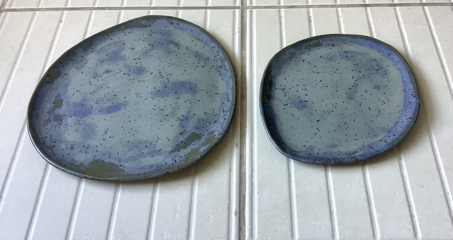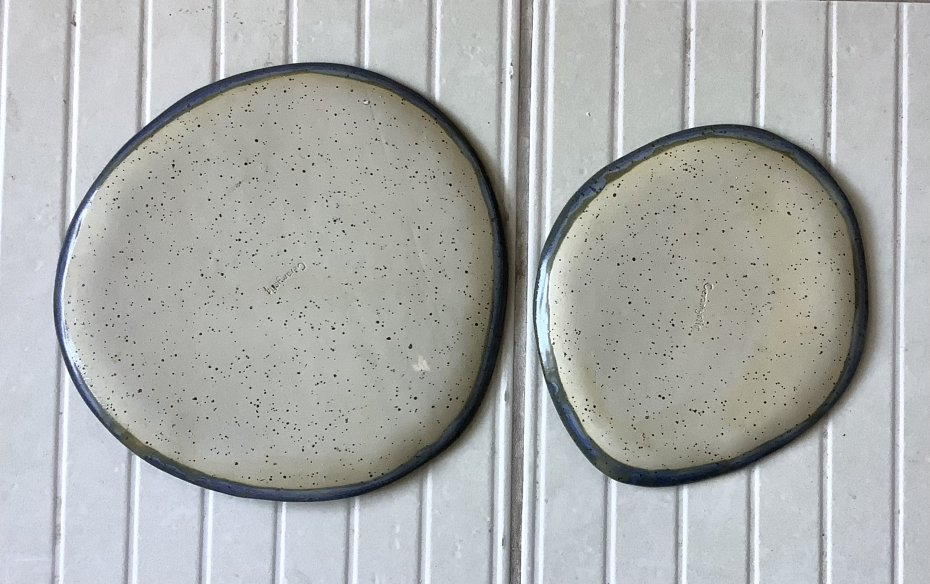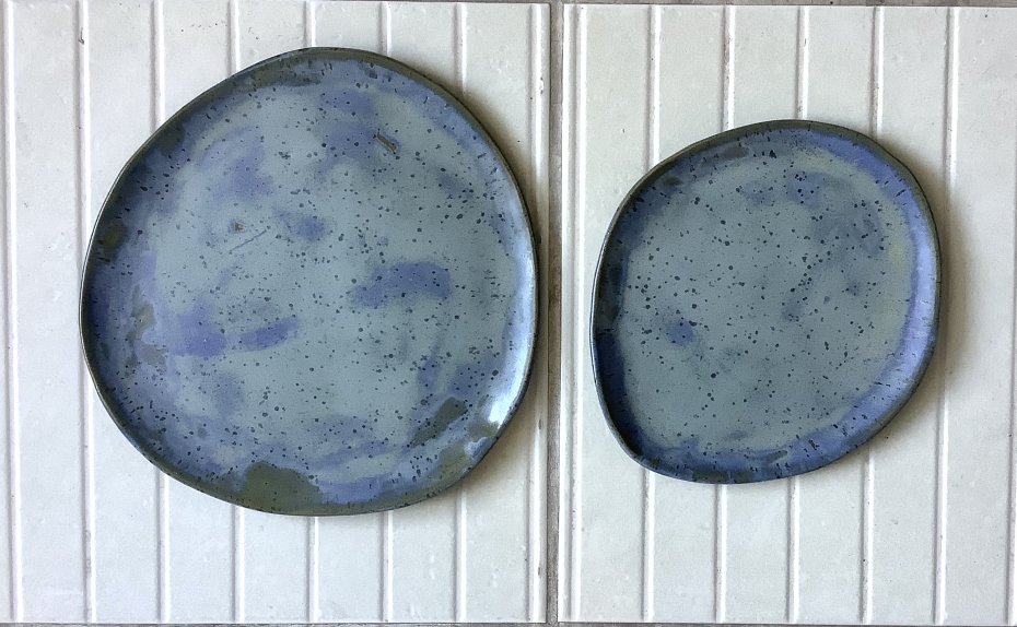 Zapraszam do kupna talerzy ręcznie robionych z jasnej kropkowanej gliny. Każdy wyjątkowy i jedyny w swoim rodzaju, chociaż szkliwione tym samym szkliwem - niebieskim z jaśniejszymi rantami i z drobniutkimi kropeczkami w kolorze kobaltu. Komplet składa się z 2 talerzy: dużego i mniejszego. Wymiar dużego talerza: 24 x 23,5 cm, mniejszego: 18 x 20,5 cm.