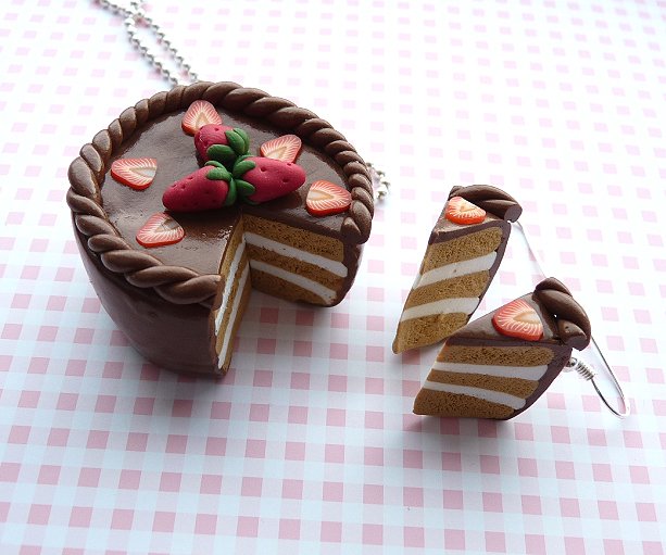 Komplet-kolczyki i naszyjnik ze słodkim tortem w czekoladowej polewie, z bitą śmietaną i truskawkami:) średnica tortu w naszyjniku: 3cm, długość kulkowego łańcuszka: 60cm, długość całkowita kolczyka: 4cm. Wysyłam ozdobnie zapakowany;)