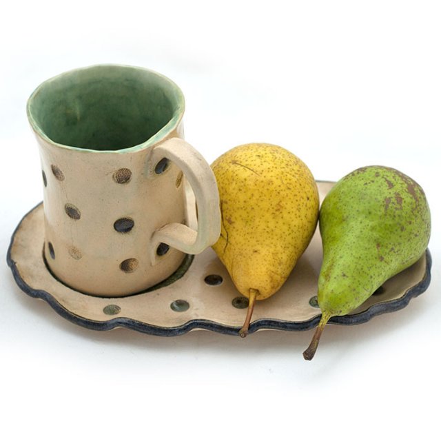 Jest to ręcznie wykonany ceramiczny komplet, kubek wraz z talerzykiem, w odcieniach beżu i zieleni.