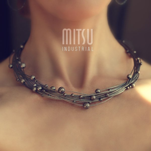 Cyber natura industrialna =D zamknięta w klasycznie elegancką formę. Kolia wykonana jest ze stalowych linek pokrytych nylonem oraz metalowych teksturowanych kul. Zapięcie na magnes. Długość ok: 48 cm. Naszyjnik podróżuje ładnie zapakowany. Do kompletu delikatne kolczyki wkrętki, z kulą wielkości 6mm. Polecam!