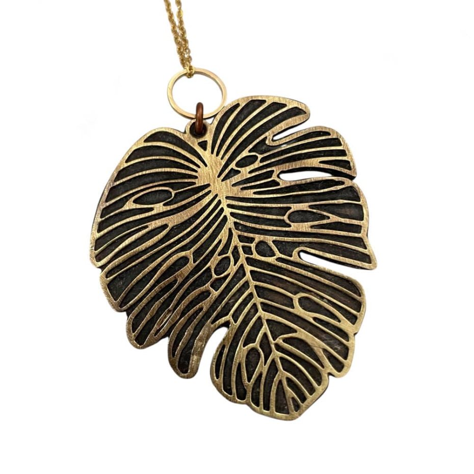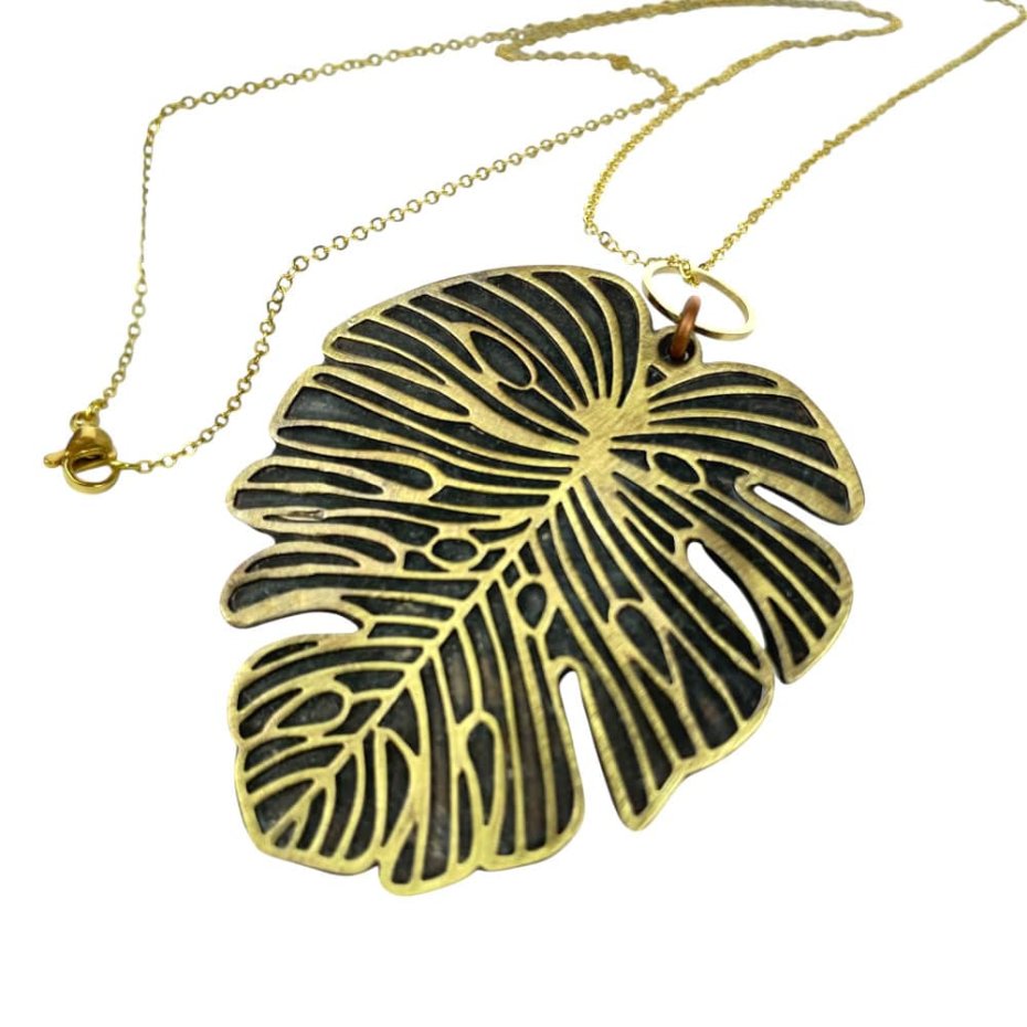 Ten komplet biżuterii czerpie inspirację z natury oraz charakterystycznej struktury liścia monstery. Połączenie delikatnie czernionego mosiądzu z przecieraną miedzią tworzy efekt subtelnego postarzenia, nadając całości szlachetnego, lekko surowego charakter. Organiczne kształty liści podkreślają naturalność formy i sprawiają, że biżuteria wygląda jakby była bezpośrednim przedłużeniem przyrody.