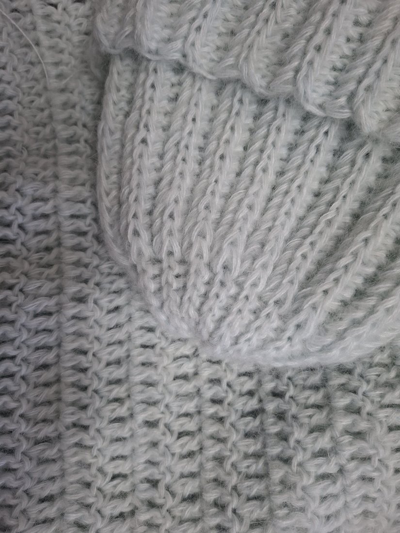 Ręcznie robiony komplet z moheru, składający się z czapki typu beanie oraz komina. Wykonany z wysokiej jakości przędzy moherowej, niezwykle miękkiej, puszystej i lekkiej, o delikatnym, jasnym odcieniu (lodowa mięta / bardzo jasny błękit).