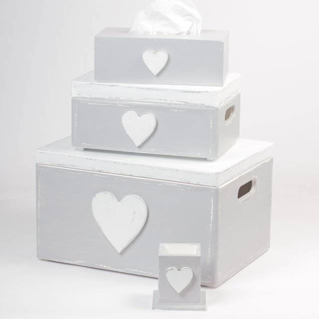 Komplet świetnie nadający się jako dekoracje do każdego wnętrza, w kolorach szarym i białym. W jego skład wchodzi pudełko zamykane duże i małe, chustecznik i pojemnik na np. przybory do pisania.