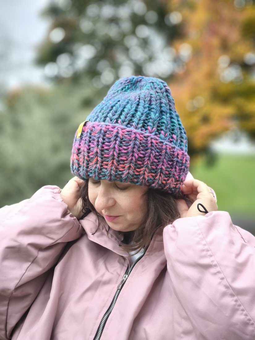 Czapka zrobiona jest wzorem ściągaczowym i pasuje na głowy o różnych obwodach,