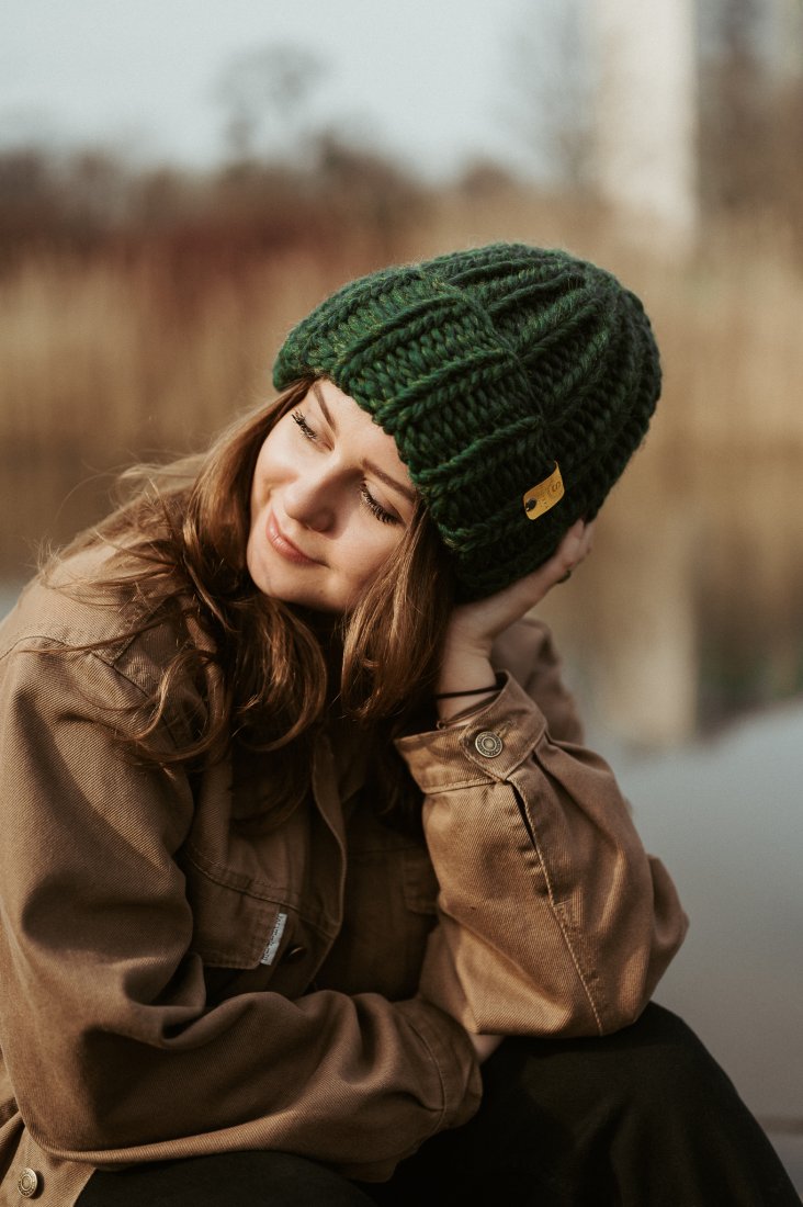 Wełniana czapka jest bardzo elastyczna, zrobiona grubym splotem,