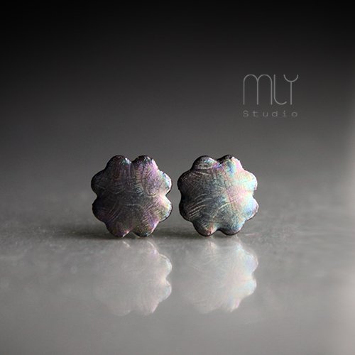 Okrągłe ceramiczne kolczyki w formie sztyftów, ręcznie wykonane z delikatnej gliny kamionkowej, jednostronnie szkliwione stalowoszarym szkliwem z efektem plamek, na antyalergicznych sztyftach w kolorze srebrnym. Średnica ok. 8mm.Polecam