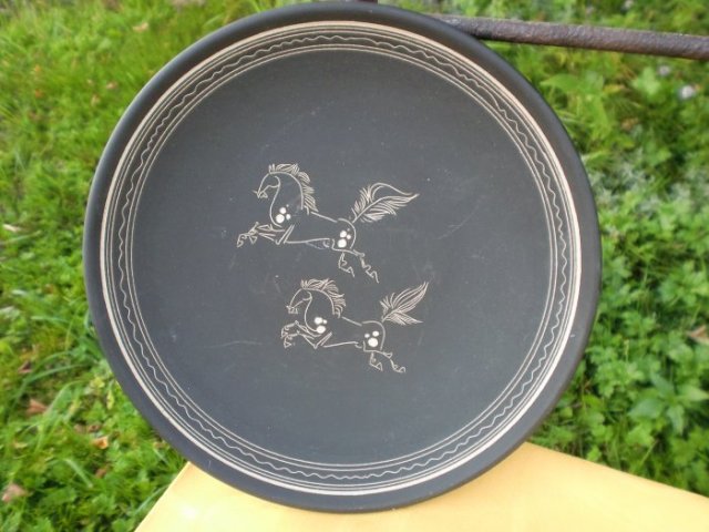 Ceramiczny talerz do powieszenia ręcznie robiony z gliny w kolorze gorzkiej czekolady, wypalonej na surowo bez szkliwienia - matowy. Zdobiony 2 konikami w galopie i skromnym prostym szlaczkiem na brzegu. Rysunek koni bardzo dynamiczny, artystyczny.