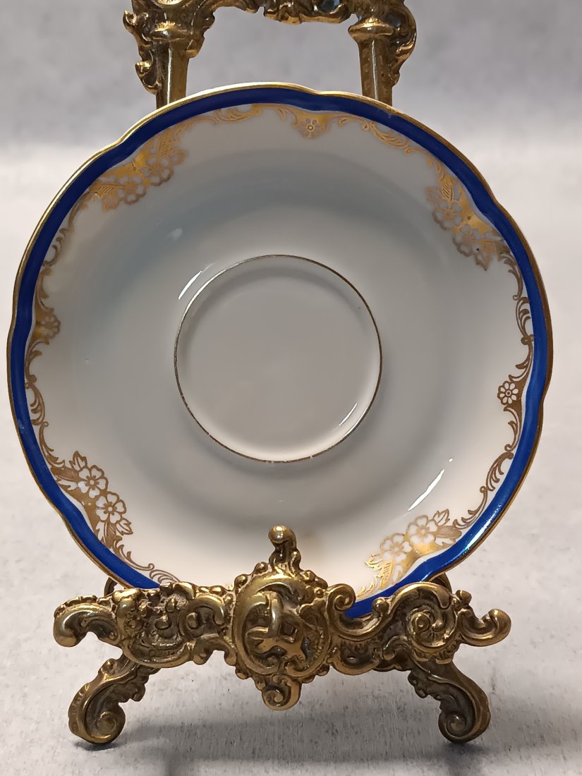 Kolorystyka: Podobnie jak filiżanka, kremowy z niebieskim obramowaniem i złotymi zdobieniami.