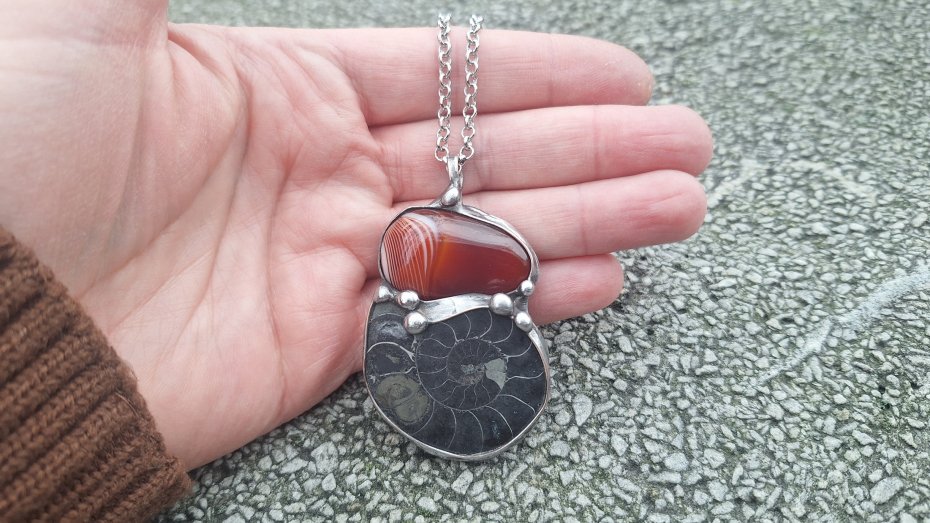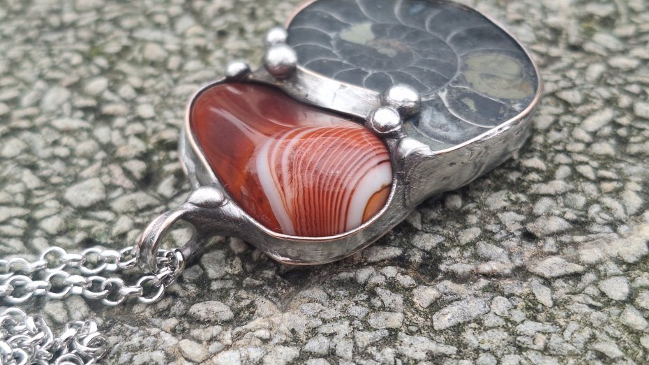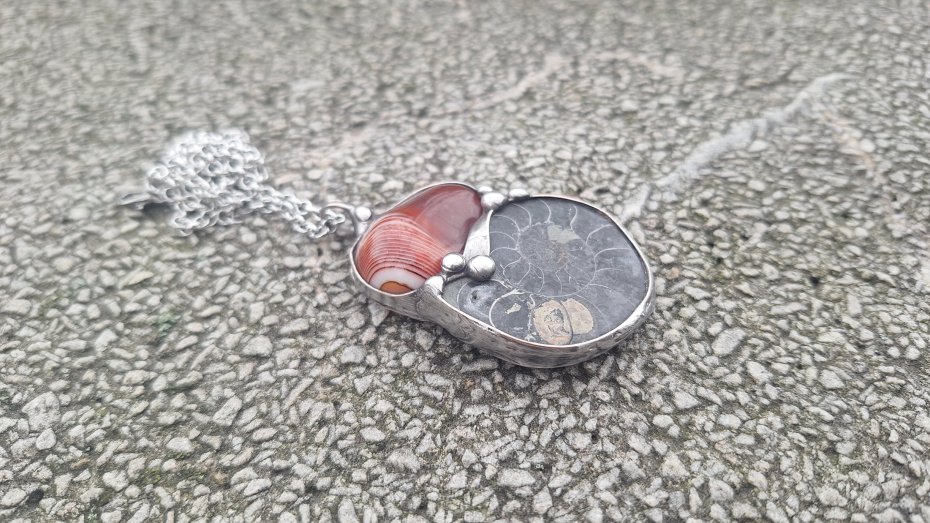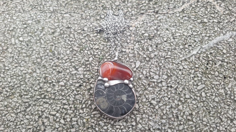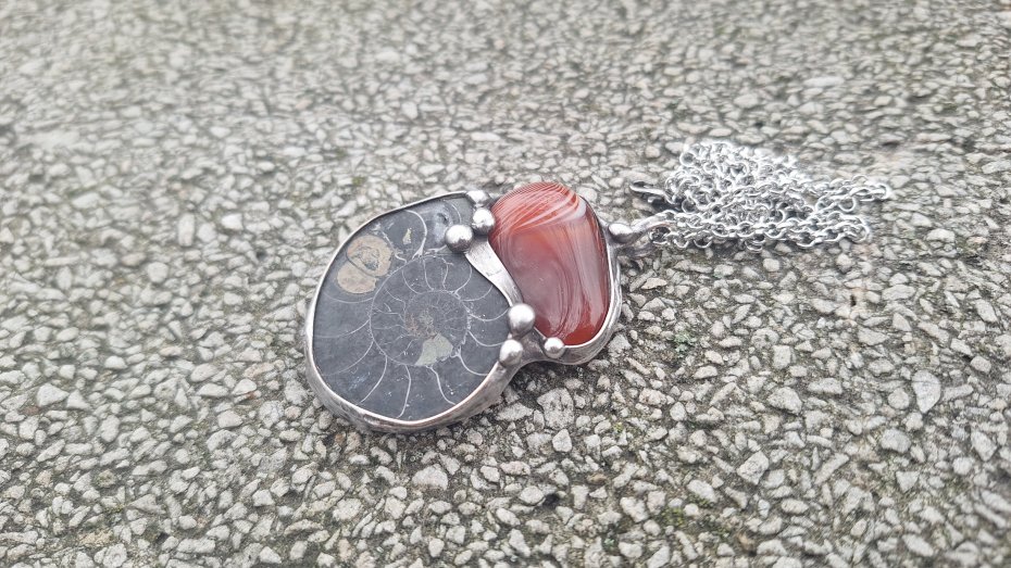 Wisiorek wykonany z miedzi, cyny, agatu i amonitu. Wymiary ok. 5.5 na 3.5 cm. Łańcuszek o długości ok. 50 cm.