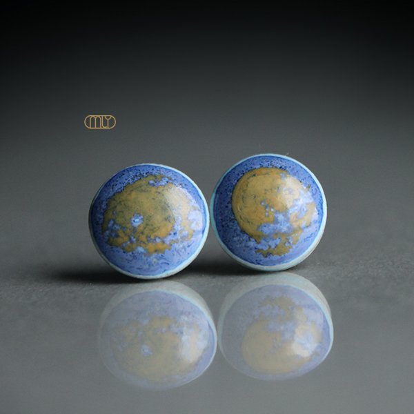 Ceramiczne, lekko nieregularne kolczyki w formie sztyftów, ręcznie wykonane z delikatnej gliny kamionkowej, jednostronnie szkliwione efektownym brązowym i błękitnym szkliwem z efektem plamek, na antyalergicznych sztyftach w kolorze srebrnym.Średnica ok. 11mm. Polecam
